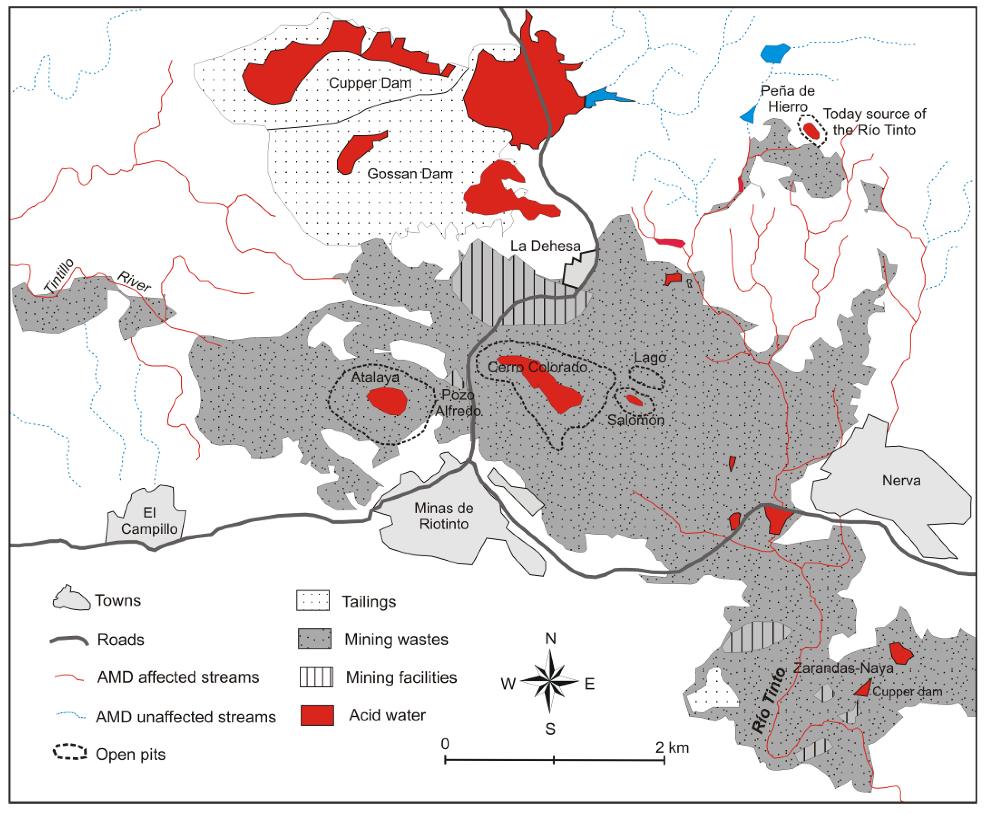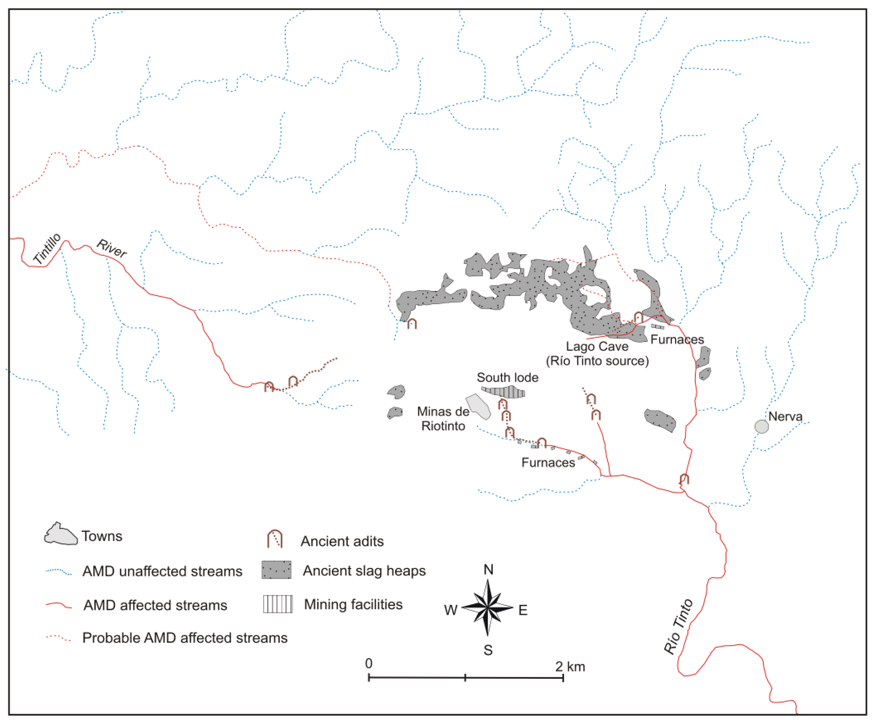 - After Roman times until the mid-nineteenth century, a period of low-intensity mining occurred. However, due to the longevity of the processes of acid mine drainage, acidic leachates are still produced in the old Roman mines affecting areas of the headwater of the Río Tinto. Until 1850, the water between the Peña del Hierro and Lago Cave, and also in the lower reach of the river and in its estuary, was of good quality.