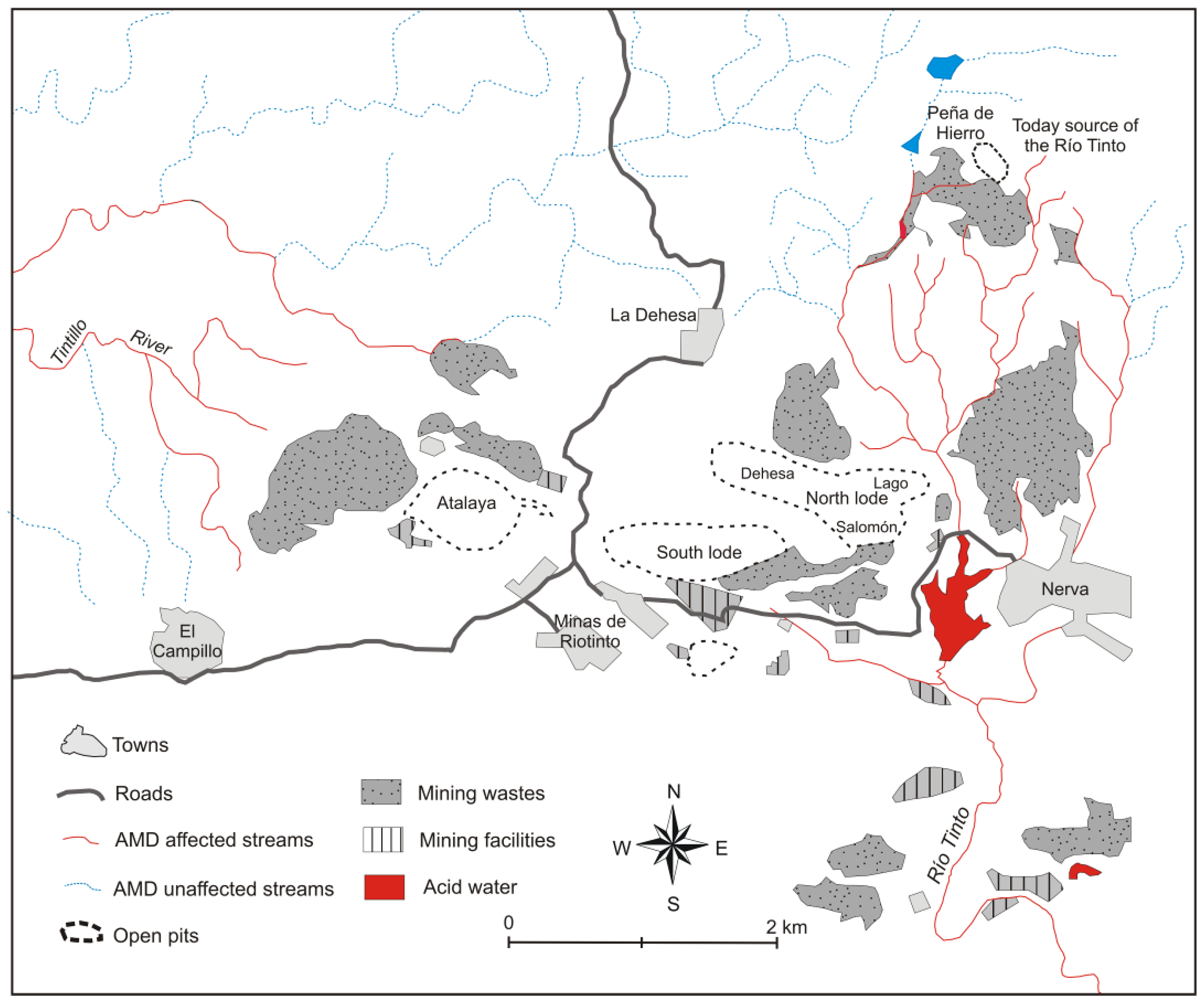 The Río Tinto drains the eastern part of the Iberian Pyrite Belt (IPB), an area with a huge amount of massive sulphide deposits that has been mined for the last 4500 years. This river presents extreme conditions, with very high concentrations in solution of metals and metalloids and low pH values. Mining activities in the upper part of the watershed of the Río Tinto have been documented since historical times and a huge amount of widespread acid-producing mine residues exist in this area. Nevertheless, there is no consensus among the scientific community as to whether the extreme conditions of the Río Tinto are the result of natural processes or the intense mining activity in the region. Here we show, using numerous geological, archaeological and historical records, that the present quality of the Río Tinto is the result of mining activities, especially during the period 1850–2001, while natural processes of formation of acid rock drainage can be considered negligible.