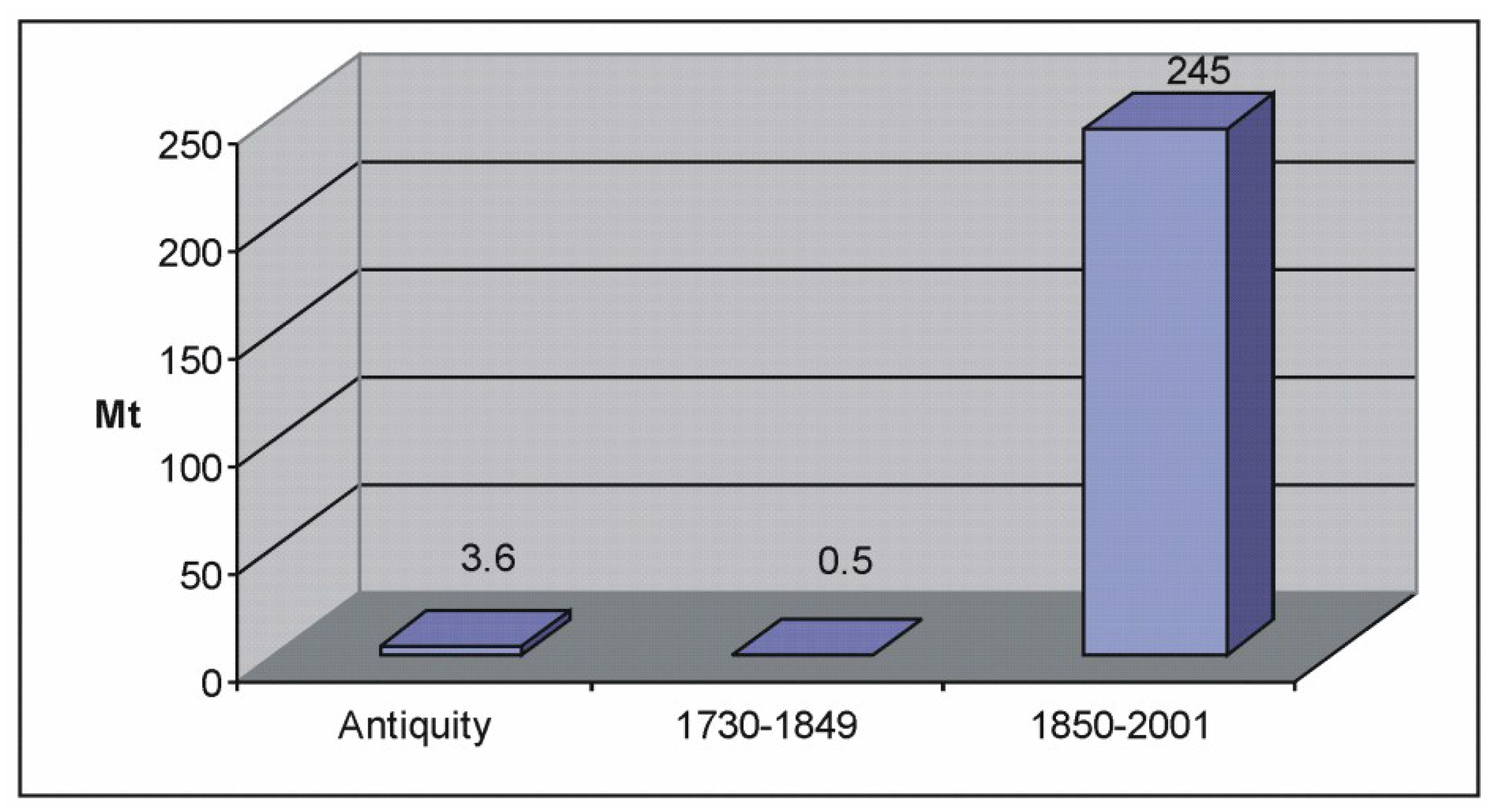 From the eighteenth century to the present, the total sulphide production of the Peña de Hierro mine was 4 Mt, while the Río-Tinto mine has extracted 241 Mt [41]. Prior to 1850, exploitation was negligible (Figure 4). The most important phase of production occurred in the 1970–2001 period, with almost 45% of all sulphides (plus 94 Mt of gossan) being produced. Comparing these figures with the ancient extractions (Figure 10), we have found that throughout the Roman and pre-Roman periods (much longer than the contemporary exploitation) extractions were less than 2% of the total production.