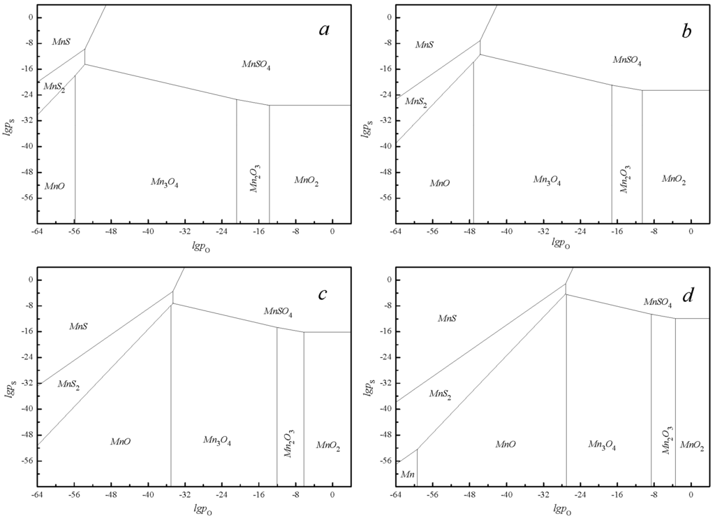 Predominance area diagram of Mn-S-O system: (a) 350 K; (b) 400 K; (c) 500 K; (d) 600 K.