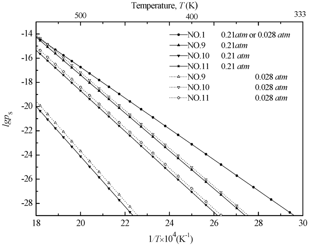 This type of above presentation does not show the effect of temperatures, however. This could be directly achieved by plotting lgpS versus temperature, or better yet against reciprocal temperature, for a constant O2 pressure, as shown in Figure 3.