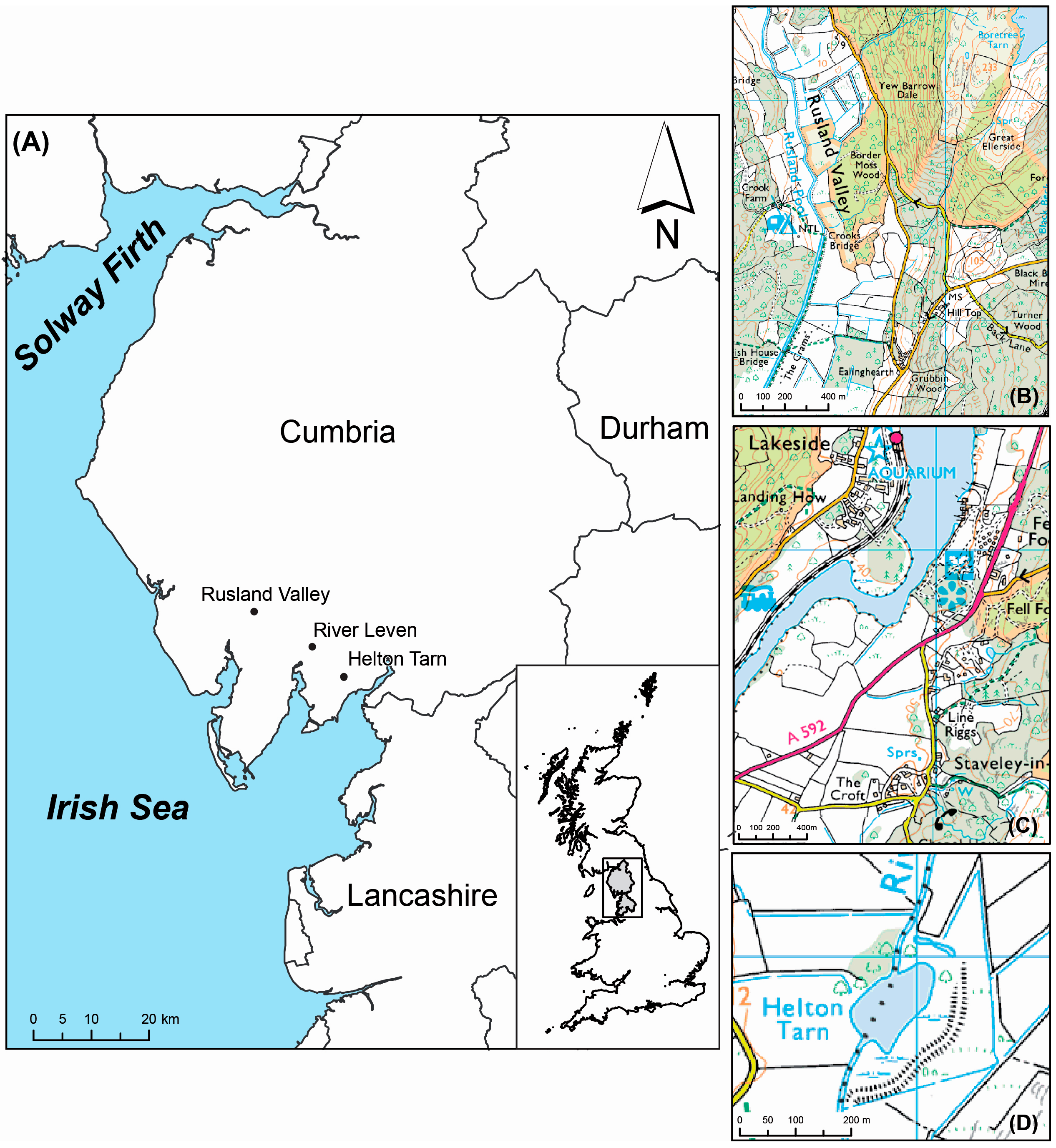 Map of study site showing: (A) Cumbria and Lancashire counties with inset map of the UK, and the Ordnance Survey base maps (scale: 1:50,000) of (B) Rusland Valley; (C) River Leven, the main study site study site; and (D) Helton Tarn. © Crown Copyright OS Master Map and 1:50,000 Colour Raster 2007. An Ordnance Survey/Edina supplied service.