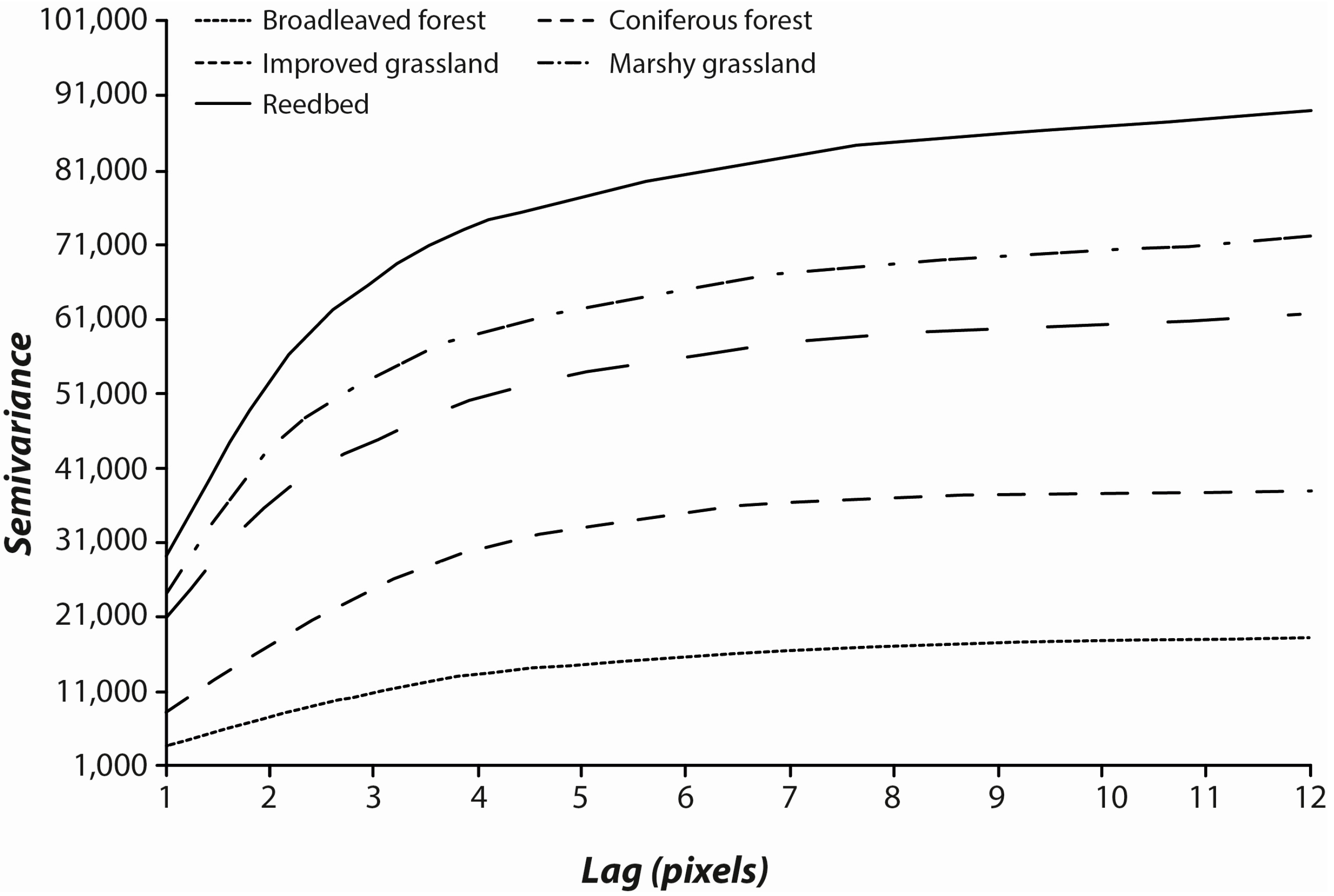 The semivariograms for major land cover types indicated reedbeds, improved grasslands and marshy grasslands started to saturate at lag distance of 3, while coniferous and broadleaved forest saturated at lag distance of 7 (Figure 2). Based on these results, the window sizes 3 × 3 and 7 × 7 were selected for computing glcm3 and glcm4 textural measures. The aforementioned GLCM texture measures were calculated from four directions (0°, 45°, 90°, 135°) of a co-occurrence matrix and the corresponding mean of all four directions was used as the output.