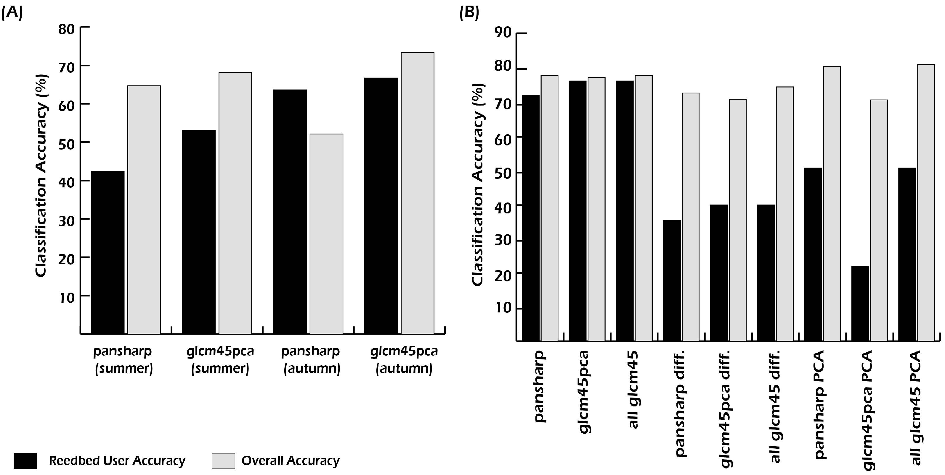 The results of the multi-seasonal image classification experiment (Table 4 and Figure 3B) indicated that the multi-seasonal pansharpened and texture combined image comprising of 16 layers (eight spectral and the eight GLCM texture measures) had the best combination of reedbed accuracy and overall classification accuracy, which were 76.5% and 78.1%, respectively. These results indicated that the optimal multi-seasonal image was more effective than the single-date images for reedbed delineation and general land-cover mapping. The increased performance of the multi-seasonal images could be attributed to the quality of phenological data contained in the combination of the two single-date images [7,11,47,48]. Guerschman et al. [7] observed that at a particular date, for two land cover types that have similar biophysical properties or are at the same phenological stage, the use of spectral data for discrimination would be low. However, the use of more than one satellite image would enhance the classification accuracy because it contains subtle phenological differences that are vital in discriminating between different land cover types during image classification.