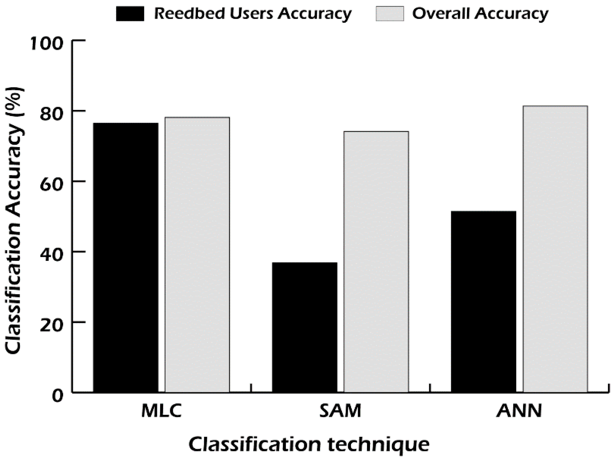 (3) The results obtained by applying three classifiers (MLC, ANN, and SAM) to the optimal multi-seasonal dataset indicated that the MLC and ANN classifiers produced the same overall classification accuracy which was significantly higher than the SAM. The MLC produced significantly higher reedbed accuracy than the other two techniques.