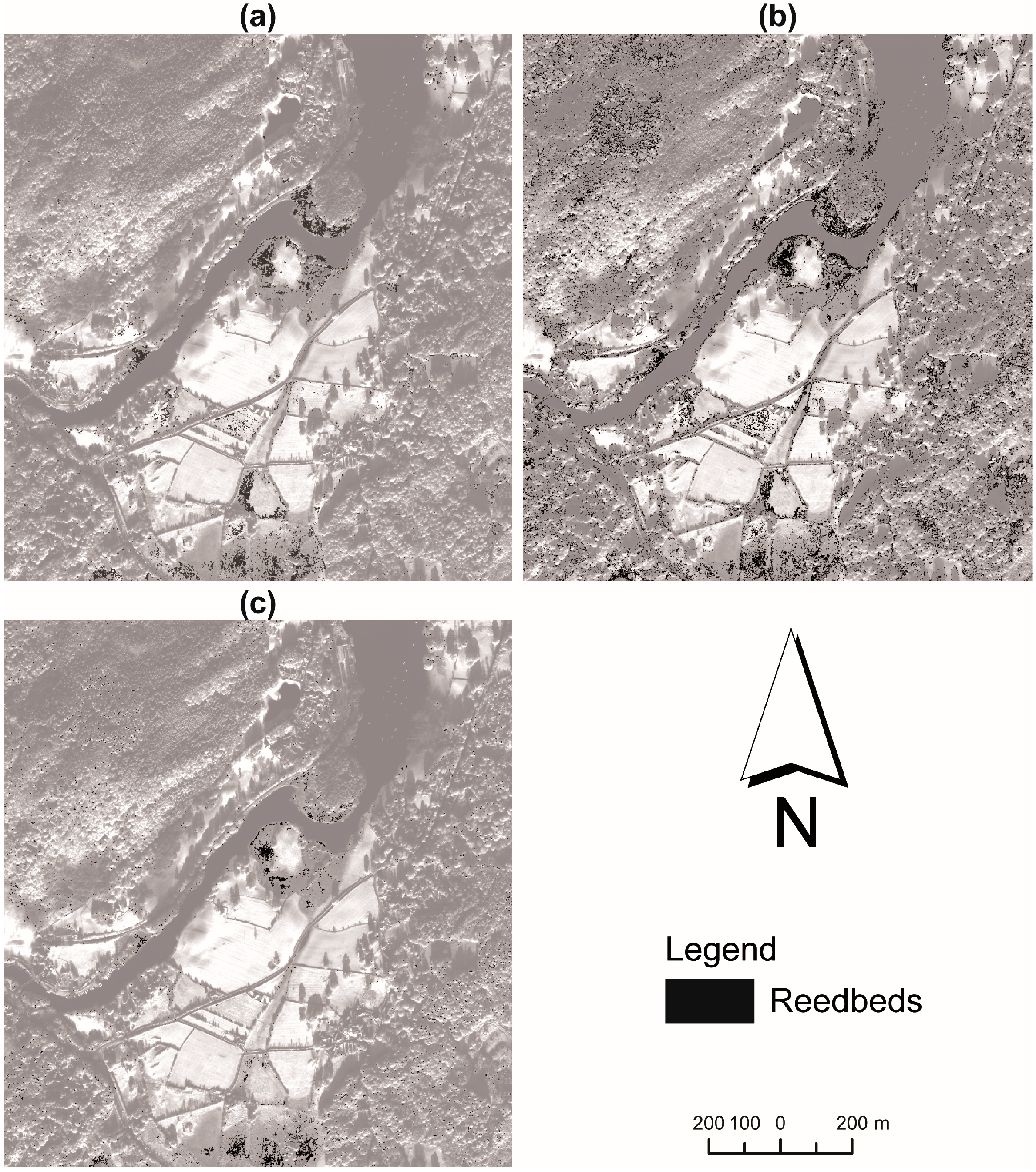 In addition to accuracy assessment, the reedbed and overall classification accuracies of each classifier were tested for significant differences using the Z statistics (Table 5). The pairwise comparison result of the MLC vs. the ANN classifiers indicated that the MLC produced a significantly higher accuracy for the reedbed class (99% confidence level). However, there was no significant difference in the overall accuracies of the MLC and ANN. This result indicates that for the reedbed classification MLC is preferred to the ANN, while for general land cover mapping either of the classifiers could be used. Figure 5a shows the reedbed map generated using the MLC. As can be seen in Figure 5b, the ANN classifier overestimates the reedbed area and confuses it with other land cover types particularly broadleaved forests and marshy grasslands while the SAM underestimates areas classified as reeds (Figure 5c).