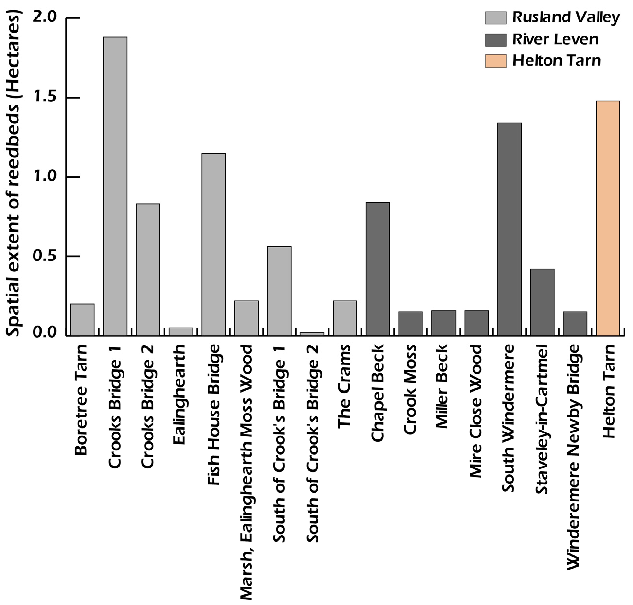 Graph showing spatial extent of mapped reedbed sites across Rusland valley, River Leven and Helton Tarn using the optimal multi-seasonal spectral and textural dataset.