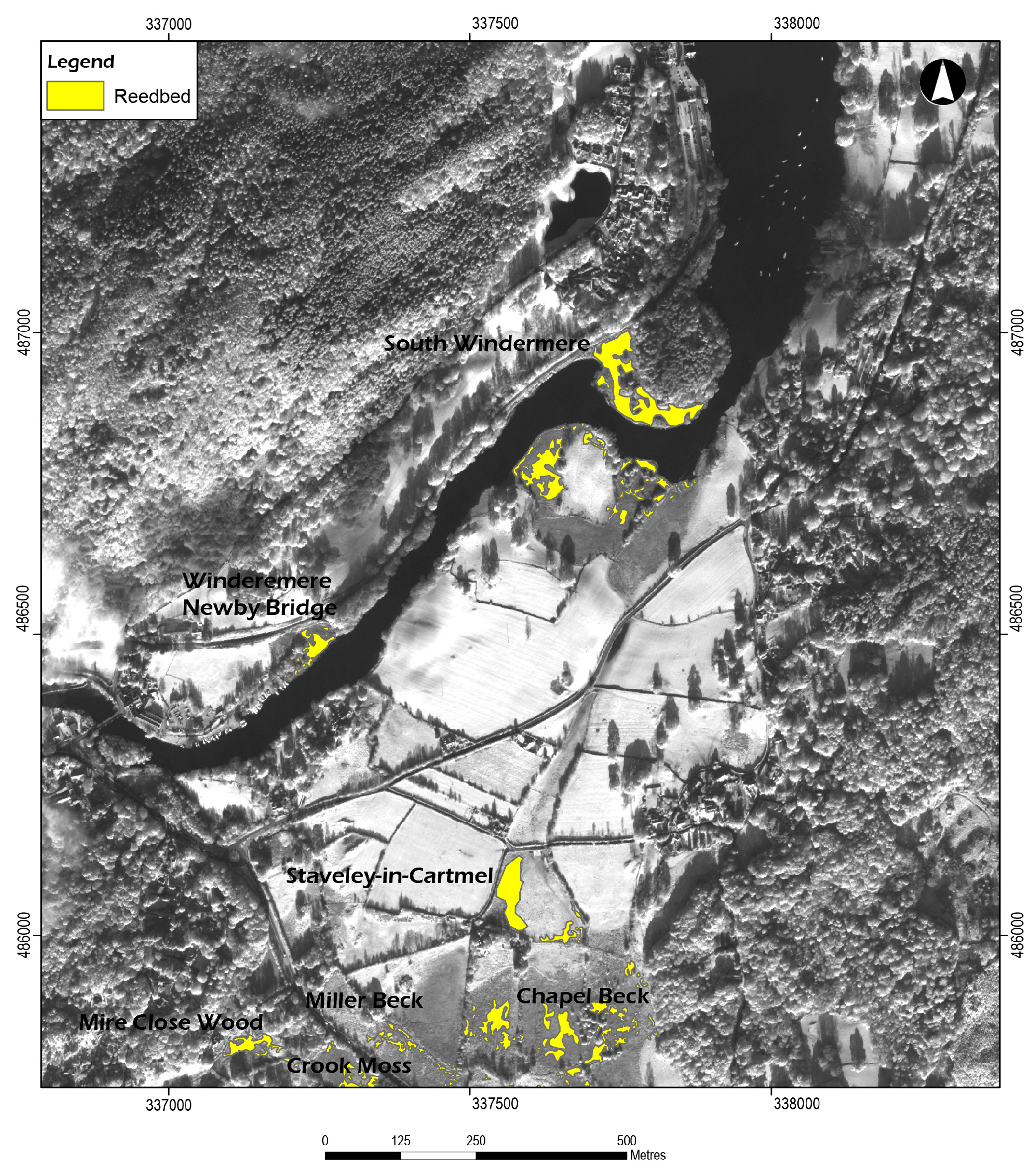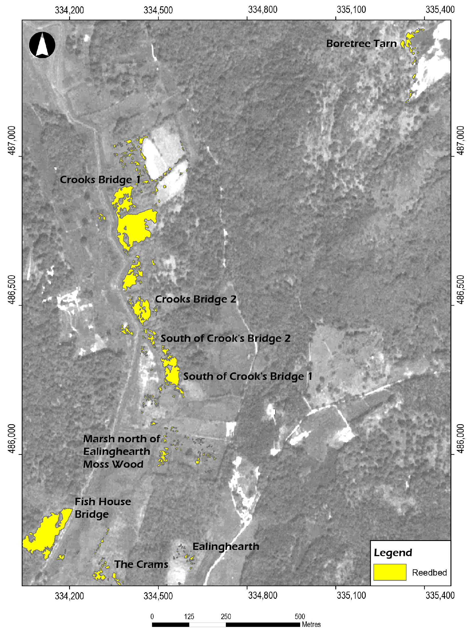 In this study, three key sites of interest were investigated, namely: River Leven situated in Cumbria, NW England (2°29′ W, 54°21′ N) with an approximate land mass of 300 hectares (ha) is dominated by a distribution of small reedbed patches spread across the landscape; Rusland Valley (3°00′ W, 54°16′ N) and Helton Tarn (2°53′ W, 54°15′ N) respectively, each with an area of 300 and 34 ha (Figure 1). The three sites were selected based on the extent and diversity of reedbed identified from existing information held by the Cumbria Wildlife Trust and Environment Agency. Some of the key reedbed sites include: Crook Moss, Chapel Beck, Miller Beck, South Windermere, Newbly Bridge, Rusland Moss, Hulleter Moss and Helton Tarn. These reedbed sites incorporate a range of combinations of different plant species existing alongside the dominant reed species Phragmites austrillis and Phalaris arundinacea, making these useful areas for testing remotely sensed mapping methods.