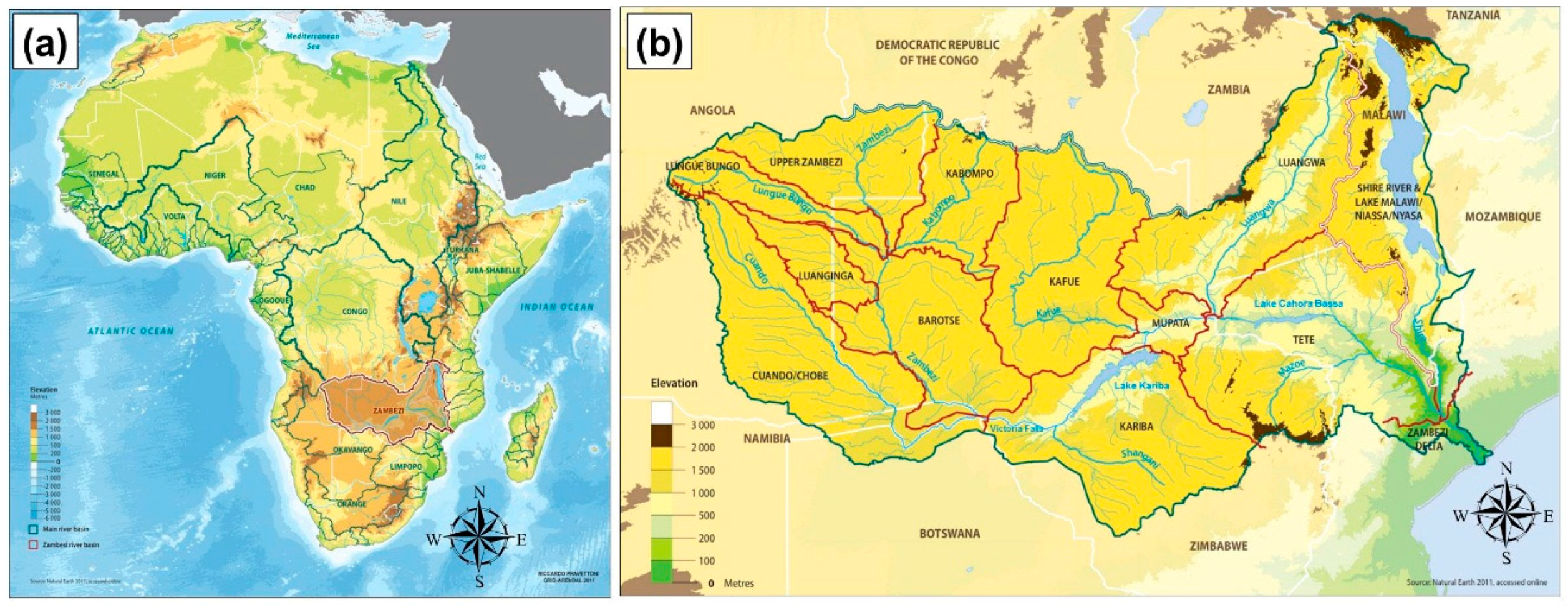 (a) Map of the African major river basins. (b) Overview of Zambezi catchment area. Maps were adapted from Grid-Arendal website [1].