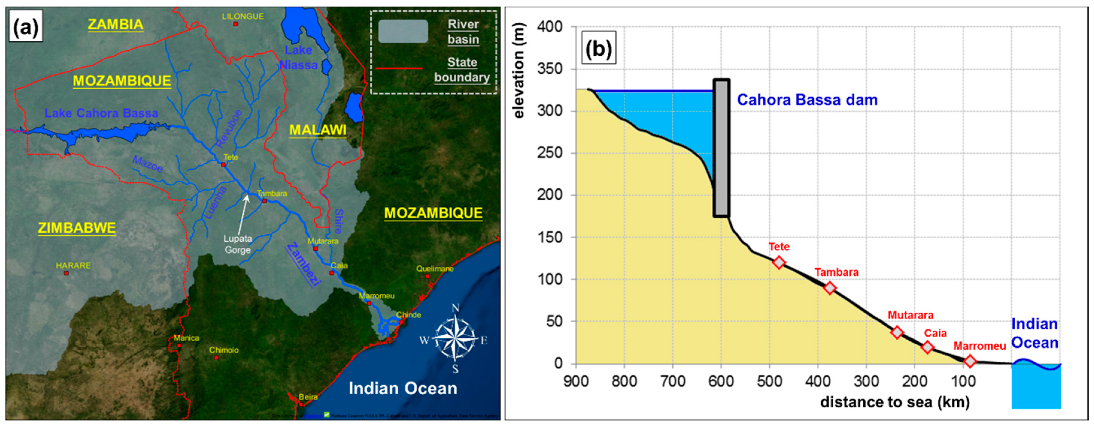 Figure 2a reports a map of the lower Zambezi region, created using QGIS software and OpenLayers plugin with MapQuest-Open Aerial and OpenStreetMap data. In Figure 2b, a longitudinal profile of the main stem of the river is plotted, derived from Ronco et al. data [14].
