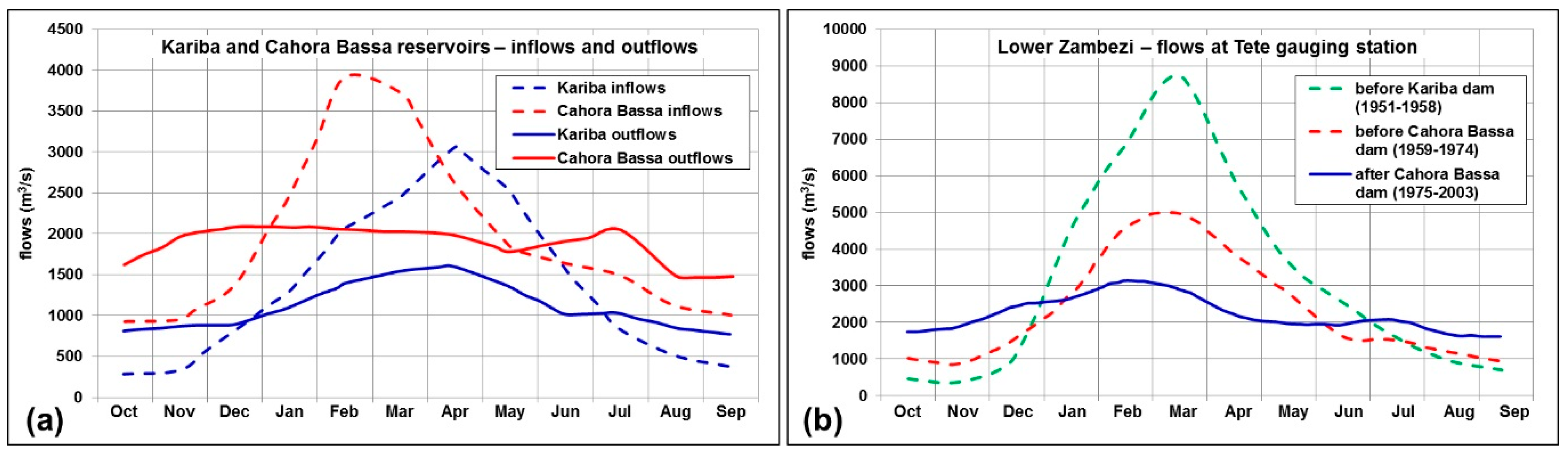 (a) Mean monthly inflows and outflows at the Kariba and Cahora Bassa dams; data from [5]. (b) Mean monthly discharges at the Tete gauging station; data from [15].