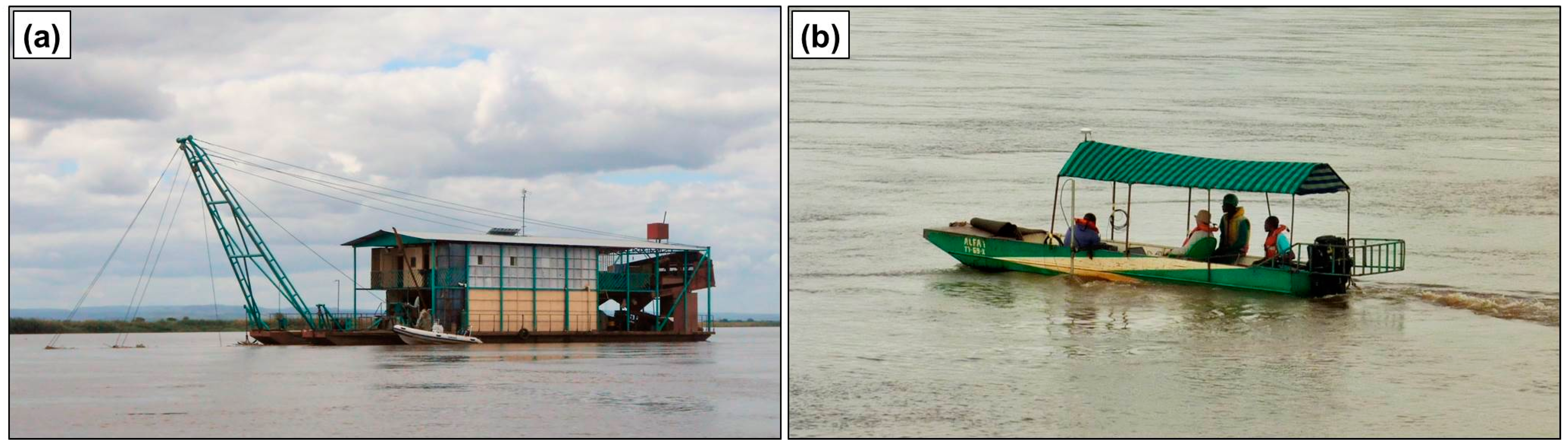 The Rio Bravo dredging platform, about 30 m long and 10 m wide (Figure 4a), was used to transport personnel and instrumentation along the Zambezi and served as a logistic base during the field survey.