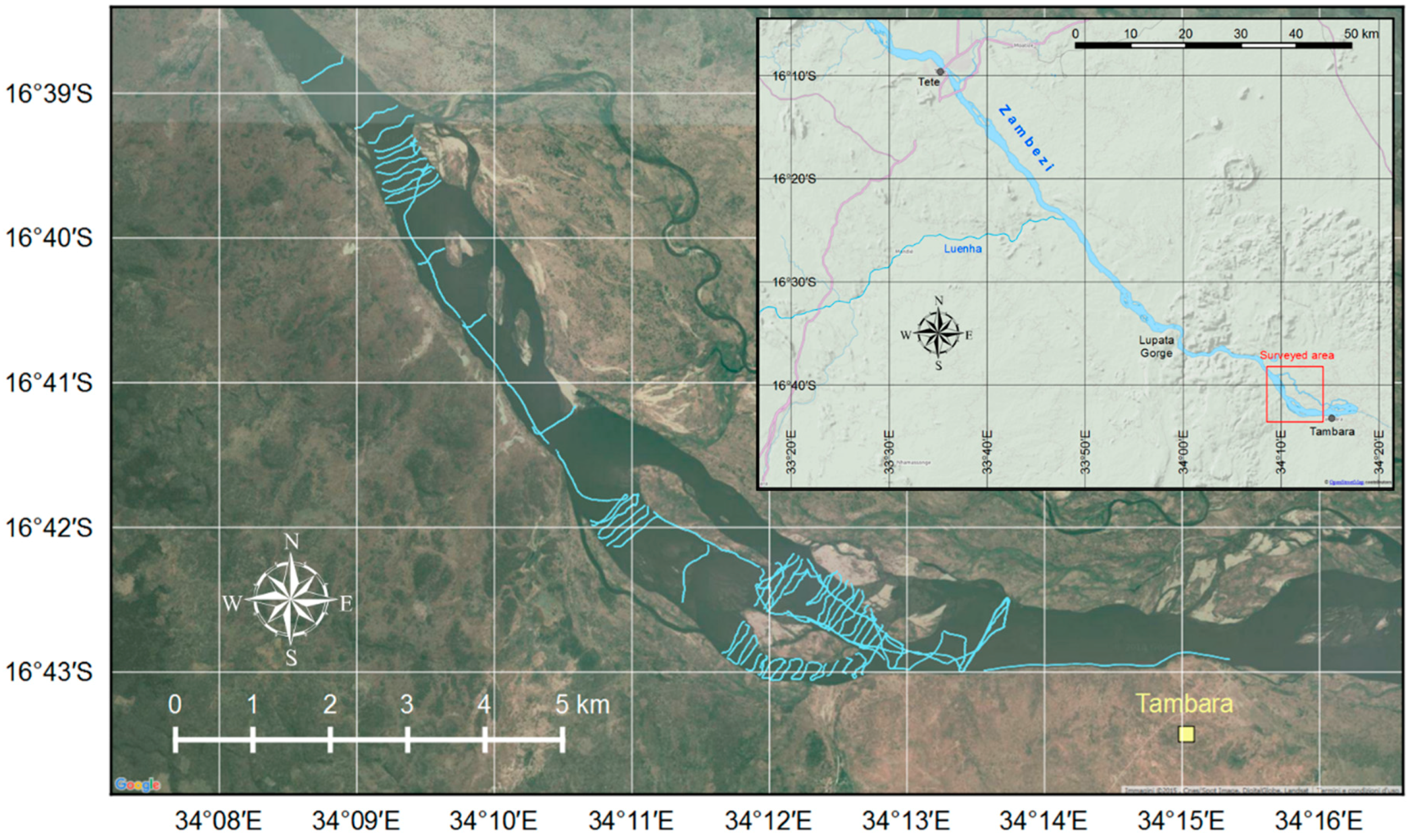 During March 2013, a bathymetric survey was performed along a reach of the lower Zambezi River near Tambara, about 230–240 km downstream of the Cahora Bassa dam. The survey was conducted in the framework of a wider research program, in cooperation with Minas Rio Bravo Lda., a mining company based in Mozambique. A detailed description of operations and results can be found in an ENEA technical report, in Italian [34]. The month of March, immediately after the end of the rainy reason, was chosen in order to work with both dry weather, and because the expected high water level would enhance navigability.
