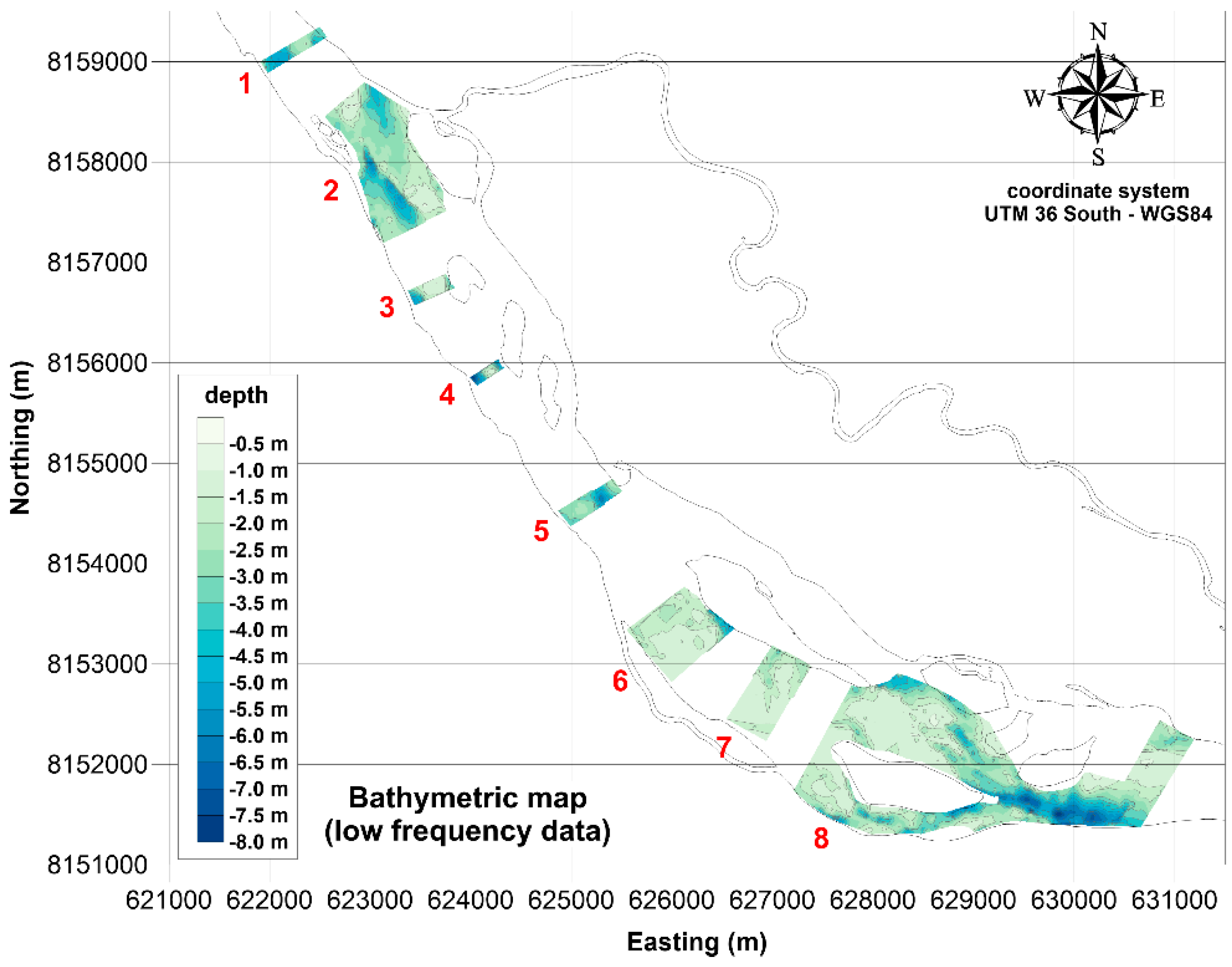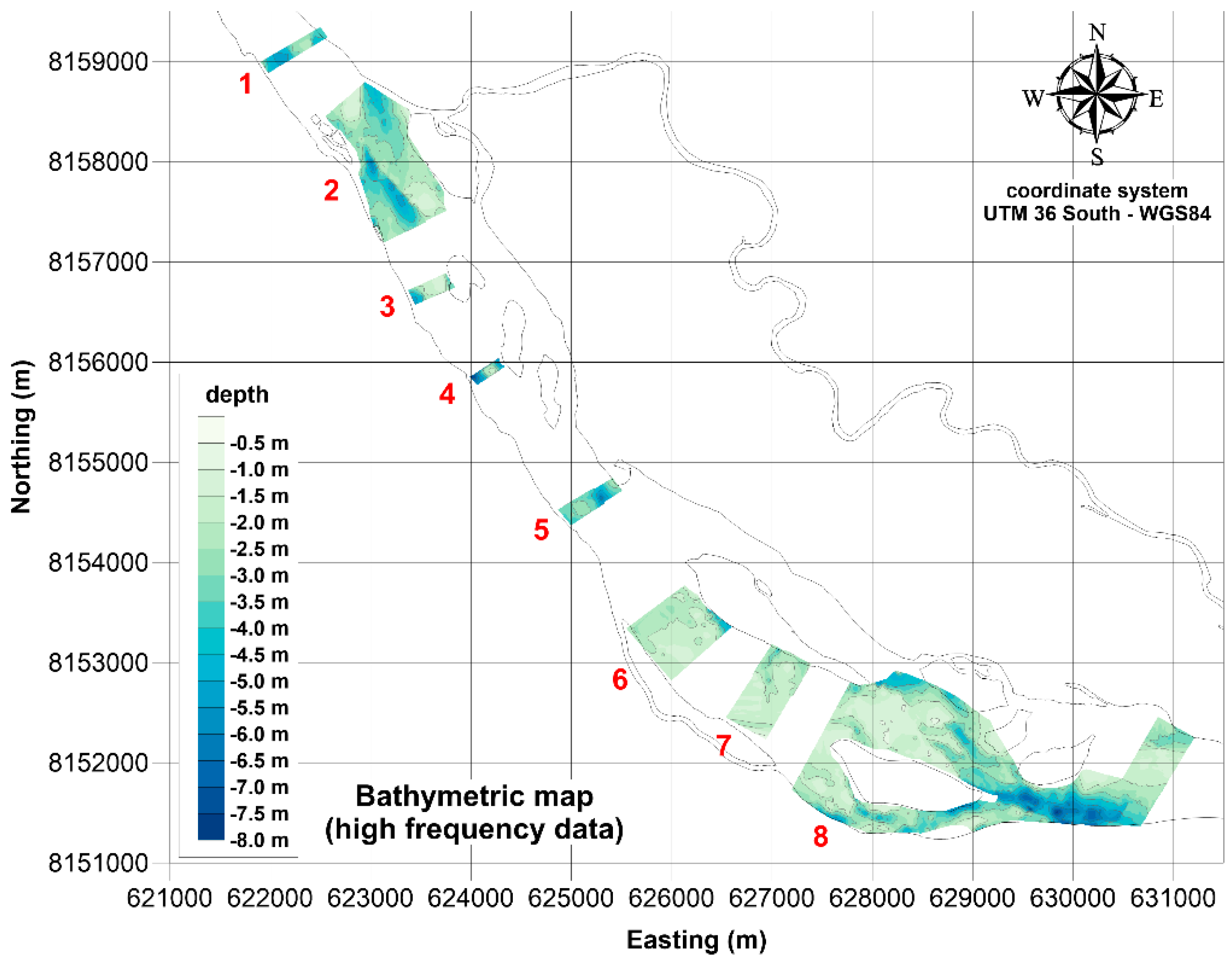 The highest values of depth, say 8.0 m, were measured close to the eastern limit of the survey area, where the river flow is confined to a relatively narrow section delimited by an island (zone 8).