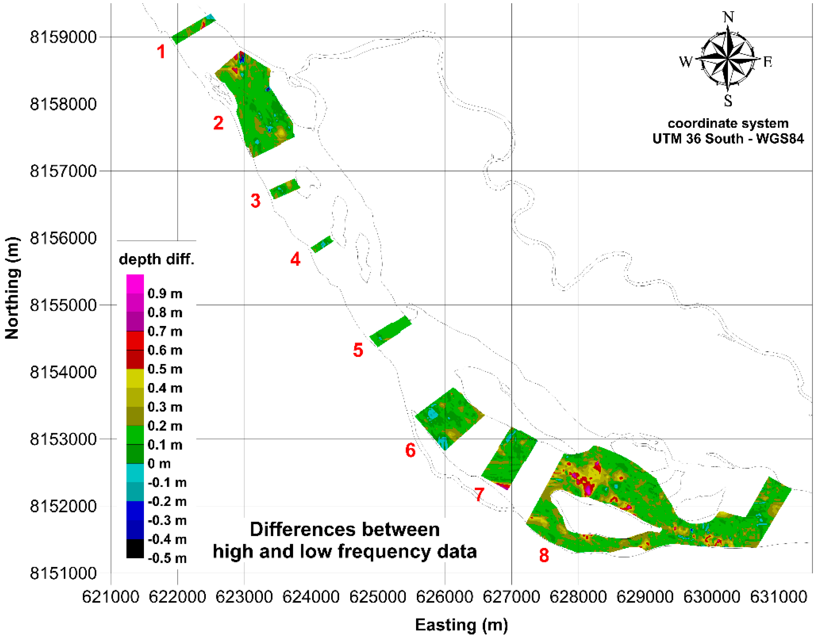 A map of the bathymetric differences between high and low frequency data is plotted in Figure 8. To a very large extent, a shift of tens of centimeters between the two signals can be observed, with low frequency depths generally greater than high frequency soundings.