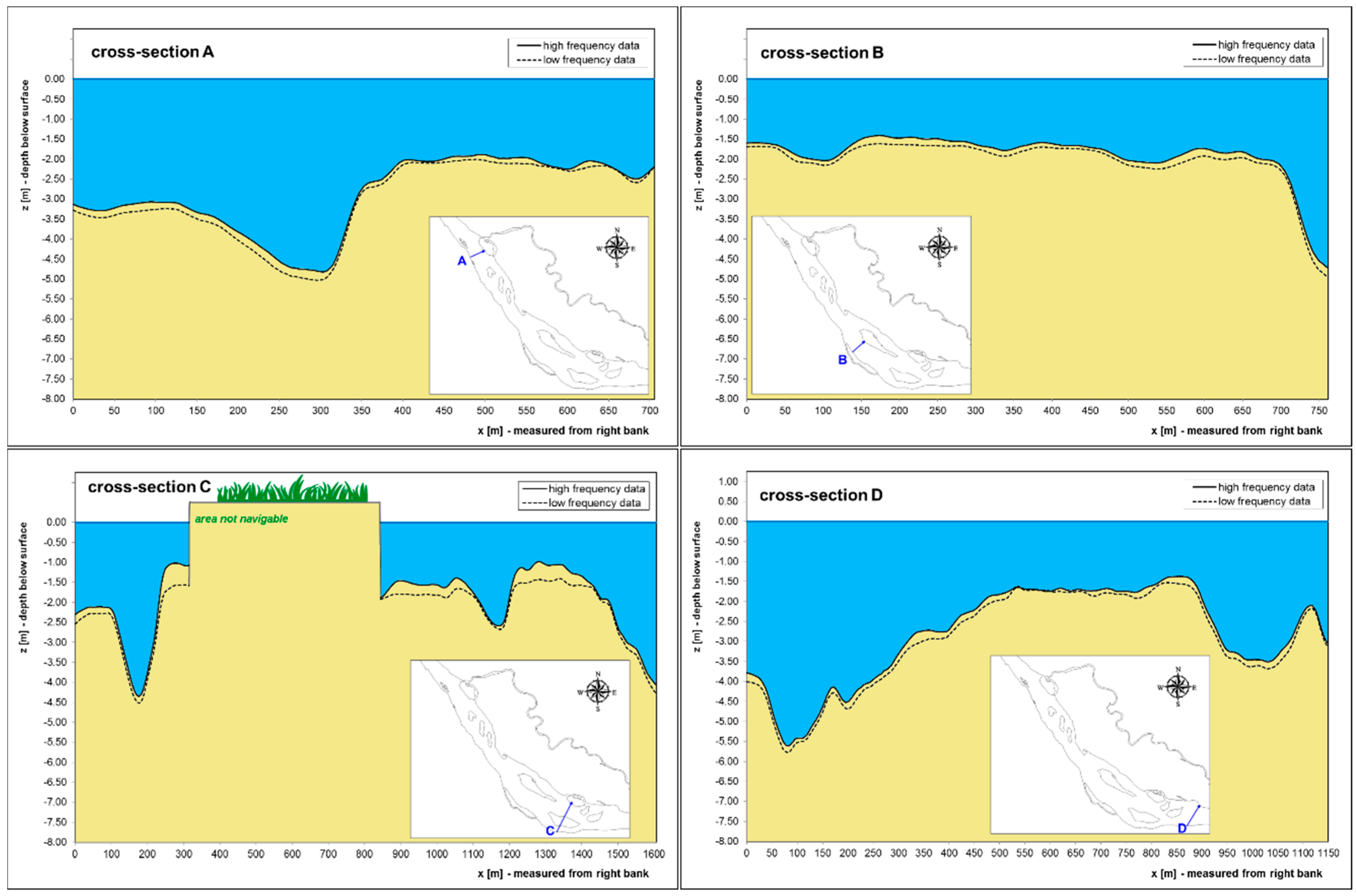 The limited extension of the investigated area does not allow us to derive general information for navigation purposes. However, the survey data show an overall quite complex bathymetry, suggesting that it could be preferable to base potential studies for navigation assessment on extensive bathymetric investigations, rather than on isolated cross-section measures.