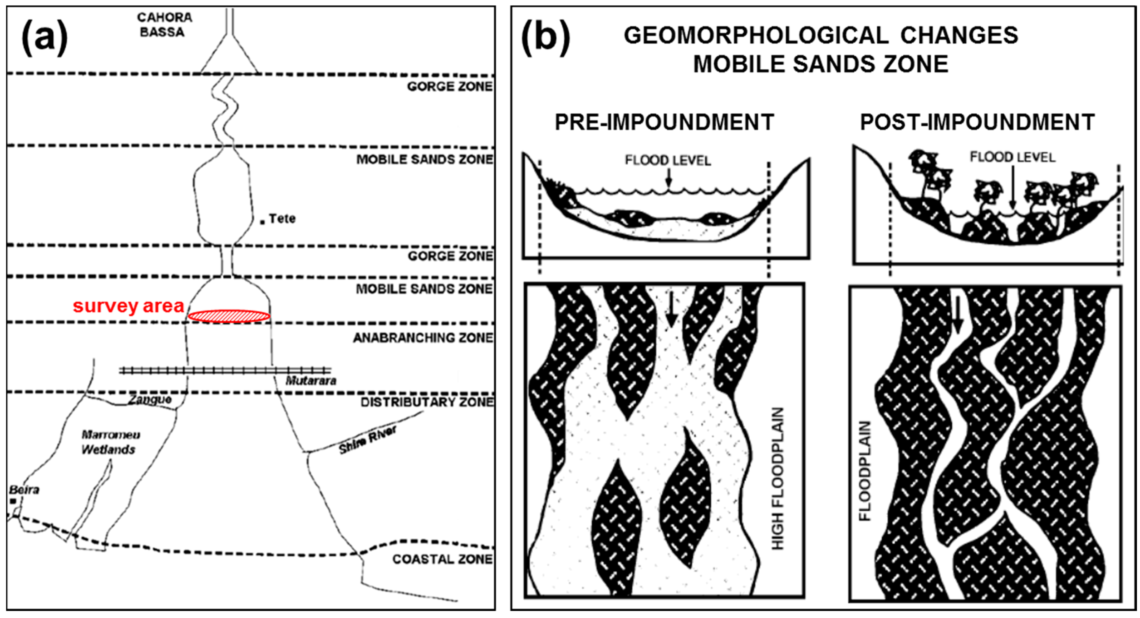 (a) Morphological zonation of the lower Zambezi valley. (b) Geomorphological changes due to Cahora Bassa dam. Adapted from Davies et al. [9] with permission from Prof. Richard Beilfuss and Schweizerbart Science Publishers [41].