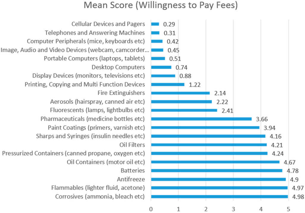 This study undertook a critical examination of the relationship between perception of environmental harm and consumer willingness to pay for environmental handling fees (EHF). This analysis was supplemented by asking study participants to indicate under what circumstances (and for what materials) they believe a visible fee is appropriate. This study found that there is a statistically significant correlation between willingness to pay environmental handling fees and the perceived environmental harm of the product on which the fee is applied. For items that respondents viewed as “innocuous to the environment” (i.e., “keyboards and mice”), they were relatively unwilling to pay an environmental handling fee. Conversely, for the full range of hazardous waste materials, consumers expressed a willingness to pay EHFs. With respect to fee visibility, respondents indicated that they preferred visible fees (at the sticker) for products that they perceived to be dangerous. There is a strong correlation between perceived environmental harm and whether fees should be visible. Consumers are not necessarily averse to paying an eco fee on products (be they hazardous waste, electronic waste, etc.), but their willingness to do so is almost entirely a function of whether they believe the product is environmentally burdensome. It is the recommendation of this study that promotion and education campaigns for environmental handling fees, particularly those surrounding waste electronics, place greater emphasis on environmental consequences of improper disposal.