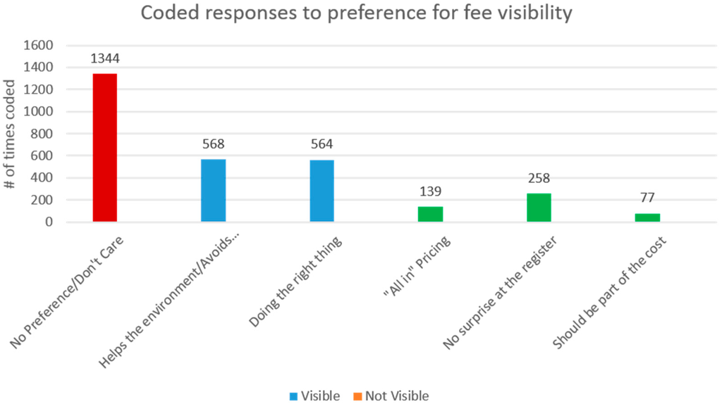 Consumer preference for fee visibility closely followed perception of environmental harm (with preference for fee visibility and environmental harm being positively correlated). While the strength of this relationship was not as strong as willingness to pay fees and environmental harm, the Pearson Correlation Coefficient (PCC) was statistically significant at 0.904. It should be noted that low levels of environmental concern were not necessarily correlated with a preference for hidden fees. In majority of instances, respondents indicated that they did not care whether the fee was visible for materials with low levels of perceived environmental concern (a score of 2 or less on the Likert scale). To add additional context to these results, study participants were asked to indicate the primary reason for why they preferred to a fee to be visible/not visible for the full range of materials included in the study—the most frequently coded results provided by study participants are shown in Figure 3.