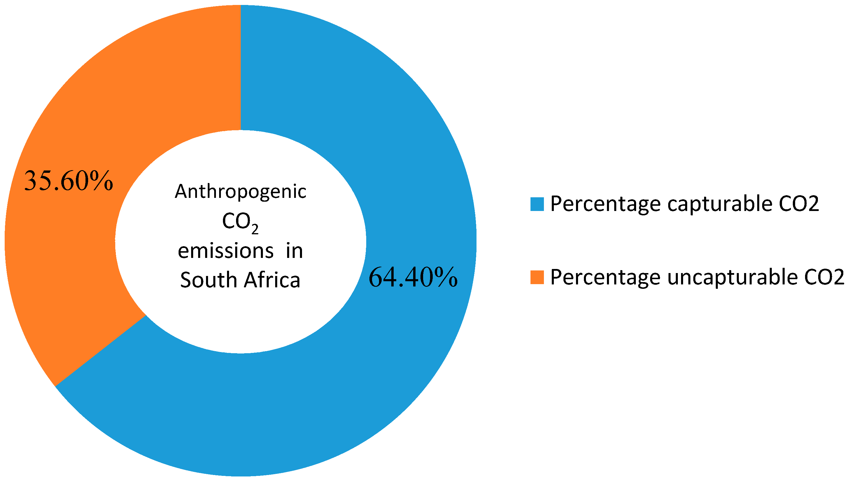 The theoretical maximum amount of capturable CO2 in South Africa is approximately 64% of all anthropogenic CO2 released [34,35,36]. Table 2 presents a breakdown of CO2 contributing sources in South Africa and the amounts of CO2 that are likely and unlikely to be captured if CCS technology were employed. It can be observed from Figure 2 that a higher percentage of CO2 emitted in South Africa is capturable, and the majority of CO2 emissions are generated by the power sector. Therefore, CCS technology would play a pivotal role in curbing the environmental pollution and health hazards caused by anthropogenic greenhouse gases, such as CO2. A report from Engelbrecht et al. [35] indicated that CCS systems can significantly reduce South Africa’s CO2 emissions if they are incorporated in coal-fired electricity-generating power plants [37]. The realization of CCS has been hampered by economic constraints, and its implementation has been discouraged in most developing countries due to high costs. Other barriers include lack of a framework, legislation and regulation from governments. Nonetheless, South Africa is a fast developing nation with sound economic policies that can fully implement CCS technology in these power plants, which is the country’s major CO2 emitter [14]. Furthermore, the implementation of CCS is economically feasible in South Africa, because it will primarily focus on coal-fired power plants, which will be less expensive than incorporating it in all sectors. South Africa can acquire skills from countries where the CCS technology is already functional and from sources like the European Directive on the Geological Storage of Carbon Dioxide (CCS Directive 2009/31/EC), which focuses on the geological storage of CO2.