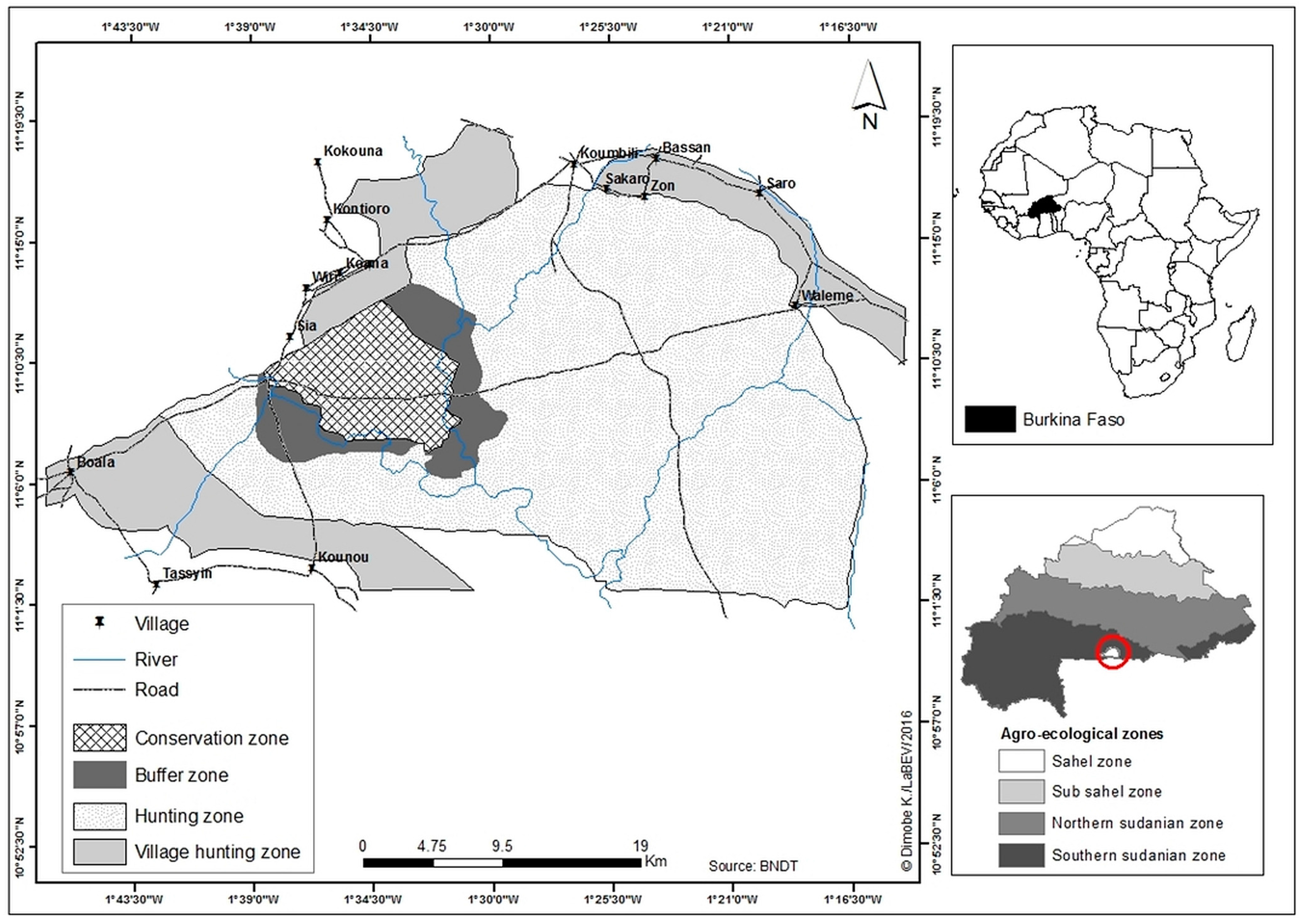 Nazinga Game Ranch was created in 1979 (Figure 1) and is spread over an area of 97,536 ha at an average altitude of 280 m above sea level (asl) [21]. According to Burkina Faso’s legislation, it has been classified as a protected area, listed as a “Wildlife Reserve” and it is very well known as a tourist destination [22]. There is a single dry season running from October to May and a single rainy season from June to September. It has a mean annual rainfall of 900 mm [23]. The average annual temperature is 27.1 °C. The Nazinga Game Ranch is traversed by Sessile River and its two tributaries (i.e., Dawevele and Nazinga Rivers); the rivers have characteristic seasonal flows. The vegetation has the characteristics of Southern Sudanian savanna. Typical species of the area include; shea tree (Vitellaria paradoxa C.F. Gaertn.), kodayoru tree (Terminalia laxiflora Engl. & Diels), female gardenia (Gardenia erubescens Stapf & Hutch.), lingahi tree (Afzelia africana Sm.), and African birch (Anogeissus leiocarpa (DC.) Guill. & Perr.), among others [24].