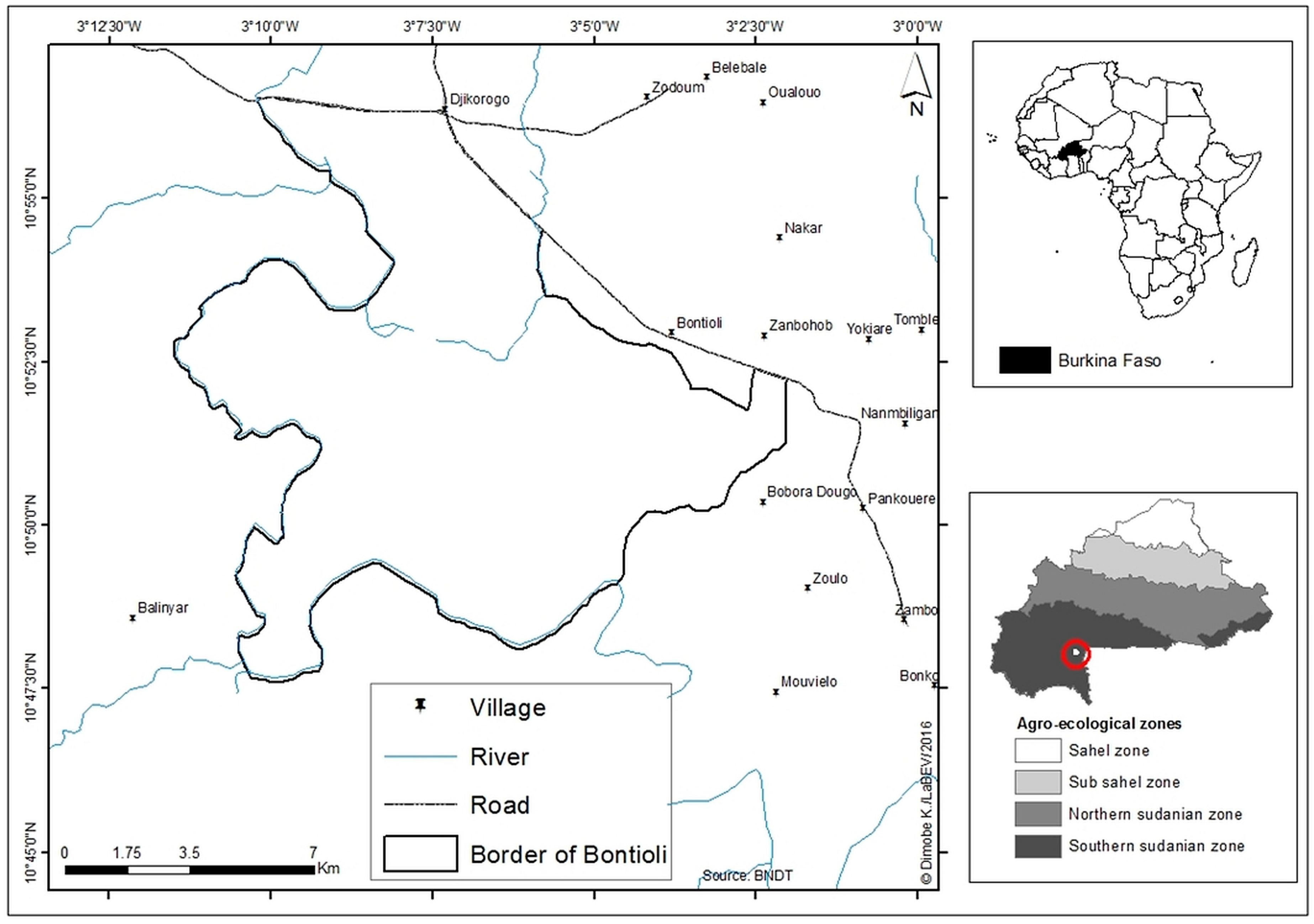 Bontioli Nature Reserve is also called ‘‘Forêt Classée de Bontioli’’ and is located in the Sudanian zone of southwestern Burkina Faso in the province of Bougouriba (Figure 2). It is a Category IV protected area, managed mainly for conservation through active management, according to International Union for Conservation of Nature (IUCN) Protected Areas Categories. It consists of the Total Reserve and the Partial Reserve. These areas were established by the territorial government during the colonial period based on two ministerial orders; (i) Order n° 3147/SE/EF of 23 March 1957, which was related to the demarcation of the area (29,500 ha) and the establishment of the Partial Reserve (ii) Order 3417/SE/EF of 29 March 1957, which was related to the demarcation of the area and classification of the Total Reserve (12,700 ha). The research study was confined to the Total Reserve only, as the Partial Reserve of Bontioli does not have consistent savanna cover due to being subjected to high pressure from human activities [25].