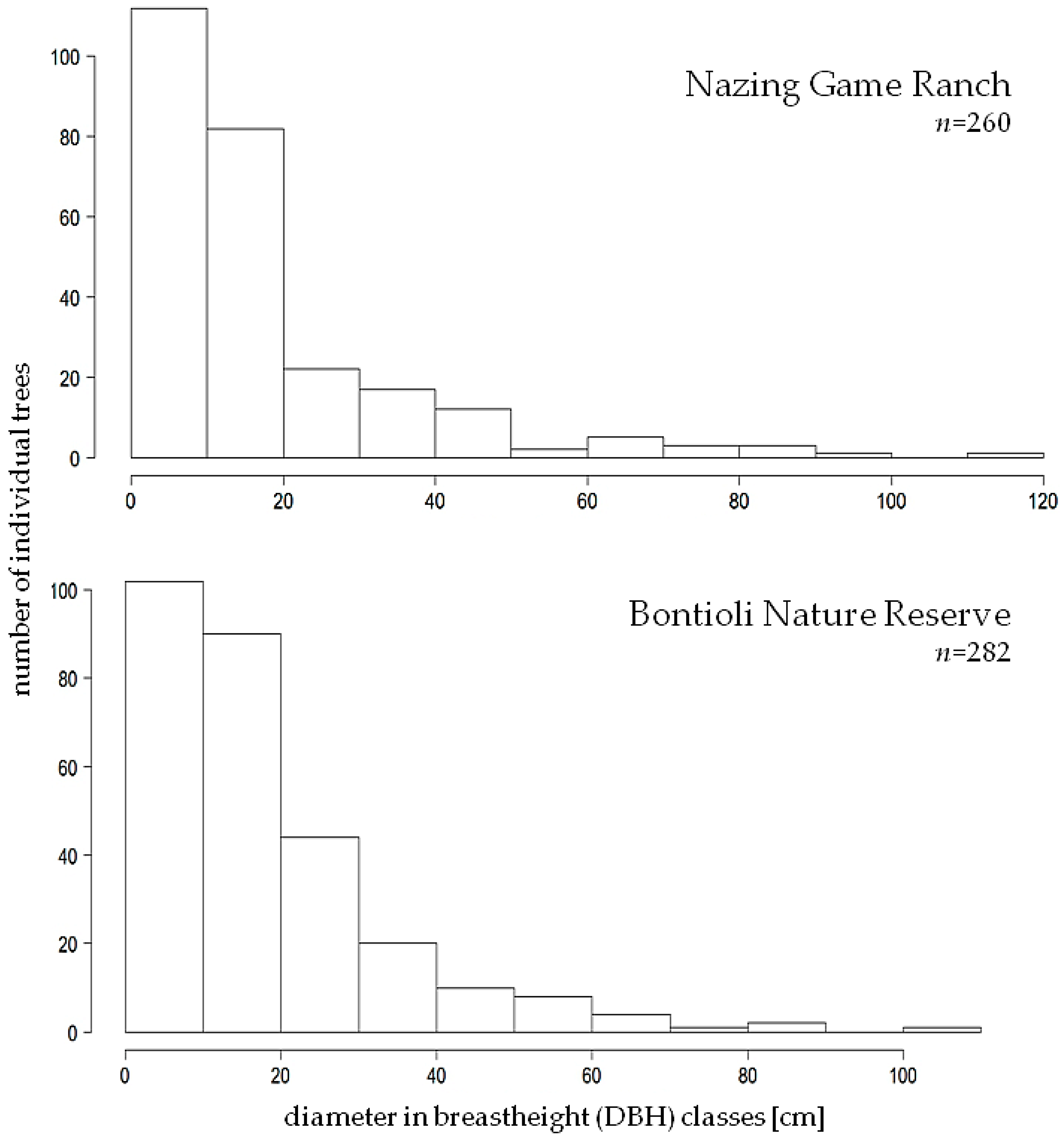 Distribution of individual trees in according DBH classes for both research sites, Nazinga Game Ranch (upper part) and Bontioli Nature Reserve (lower part).