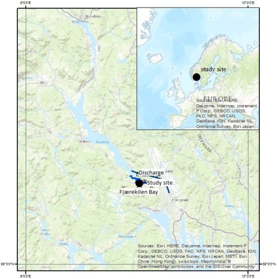 Lake Norsjø (59.29′ N, 9.36′ E) is a large (55.24 km2), deep (middle depth = 87 m, maximal depth = 171 m) and oligotrophic lake [45,46] located in Telemark county in southeast Norway. This study has been performed in Fjærekilen, which is a bay at the southern end of Lake Norsjø extending parallel to the discharge (Figure 1). The discharge to Hjellevannet in Skien is located in an adjacent bay to the north of the study site.