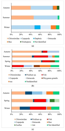 Seasonal variation in stomach content of (a) E. smelt (Winter n = 13; Summer n = 6; Autumn n = 12); (b) A. charr (Winter n = 8; Spring n = 12; Summer n = 10; Autumn n = 11); (c) Whitefish (Winter n = 11; Spring n = 4; Autumn n = 7).