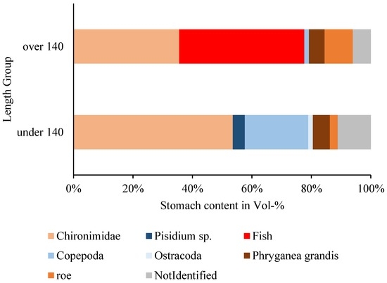 The largest A. charr, individuals >140 mm (n = 20), consumed less Chironomidae sp., Pisidium sp. and copepods (34, 0 and 2 vol % compared to 54, 4 and 21 vol %), but more roe (9 vol % compared to 3 vol %) than smaller individuals, <140 mm (n = 21) (Figure 3). Additionally, the largest individuals consumed fish (≈40 vol %). Approximately 10 vol % of the stomach content of both groups remained unidentified. Schoener’s similarity index [57,58], indicated no significant overlap in the diets of A. charr above and below 140 mm of length (D = 51%).