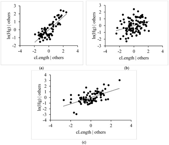 Partial linear regressions using the centered, transformed length as explanatory variable, and logarithmically transformed Tot-Hg as response variable, both corrected for all other variables included in the models for; (a) A. charr; (b) E. smelt; (c) whitefish.