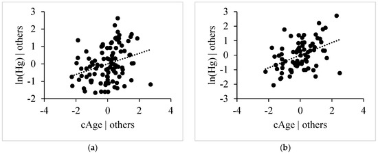 Partial linear regressions between the centered, transformed age and logarithmically transformed Tot-Hg-concentration; (a) added variable plot for E. smelt; (b) added variable plot for whitefish.