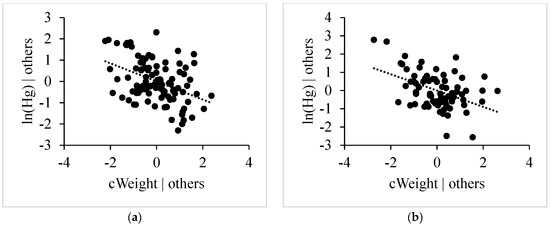 Despite the general tendency of fish with higher weight having higher Tot-Hg-concentrations, partial linear regressions between centered and transformed weight and logarithmically transformed Tot-Hg were negatively significant with slopes of −0.532 (df = 94, SE = 0.116, t = −4.57, p < 0.001) and −1.081 (df = 72, SE = 0.255, t = −4.24, p < 0.001) for E. smelt and whitefish, respectively (Figure 6). This effect is caused by the high correlation between length and weight of 0.645 and 0.962 for E. smelt and whitefish, respectively. However, as the partial regression using weight as explanatory variable is significant for E. smelt and whitefish, weight provides additional information for the estimation of Tot-Hg-concentrations in muscle fillet tissue of these species. Adding a partial linear regression with weight as an explanatory variable did not improve the Hg-model for A. charr.