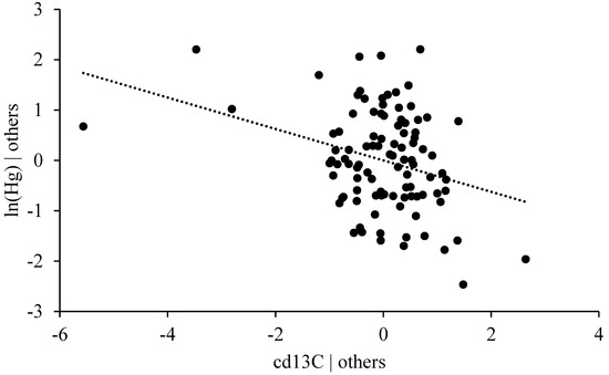 The centered stable isotope ratio of carbon, δ13C, was significantly, negatively correlated to the logarithmically transformed Tot-Hg-concentration in E. smelt (Figure 7) with a slope of −0.157 (df = 94, SE = 0.049, t = −3.18, p = 0.002). A partial linear regression between δ13C and Tot-Hg, however, neither improved the model for A. charr or whitefish.