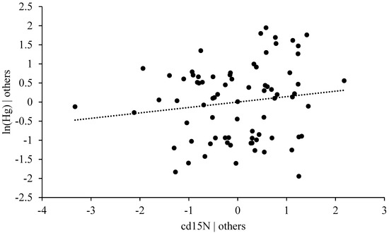 Partial linear regression between centered δ15N and logarithmically transformed Tot-Hg in A. charr. This regression was not significant, however, it was included due to heterogeneous residuals of the multiple linear regression model for Tot-Hg in A. charr.