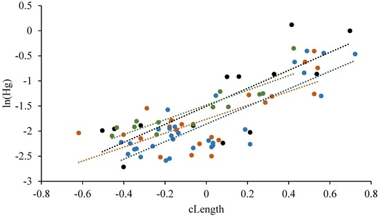 Methylated Hg is an environmental pollutant of concern in aquatic environments [1,2,3,4], as it is accumulated in biota, and concentrations rise in accordance with trophic position [5,6,7,8,9,10]. Fish and fish-eating wildlife often have toxic concentrations of total Hg (Tot-Hg) as a result [7]. In addition to trophic position, Hg-concentrations in fish are well documented to increase with increasing age [8,11] and length [8,11,12,13,14]. Contrarily, increasing weight at the same length or age results in lower Hg-concentrations, either by somatic growth dilution (SGD) [11,15,16,17,18,19,20,21], or by further concentrating Hg during starvation [22]. The combination of these two effects results in seasonal variations in Hg-concentrations in fish [23,24,25,26,27,28,29,30], however, some studies suggest that this is not the case in all populations [31,32,33].