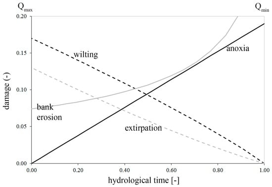 In order to evaluate the impact of different flow conditions, the present model considers, in first approximation, four typical effects generally acting along rivers during the entire hydrological year: anoxia, wilting, extirpation, and bank erosion. To simplify the description, the damages are associated with hydro-morphological quantities, involving dimensionless extremal damages assumed here to be constant []. The computed values of the four damages span between zero and one, and are functions of different constraints related to the river geometry and flow characteristics: