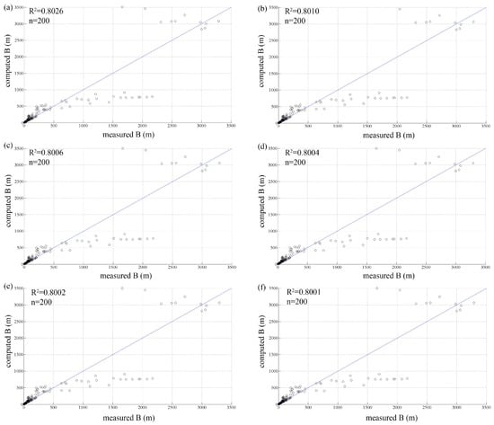 Comparison between computed and measured active river width B for different initial populations (P0): (a) P0 = 10; (b) P0 = 50; (c) P0 = 100; (d) P0 = 200; (e) P0 = 500; (f) P0 = 1000.