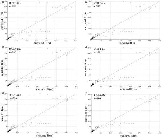 Comparison between computed and measured active river width B for different growth rates (r): (a) r = 0.010; (b) r = 0.015; (c) r = 0.020; (d) r = 0.025; (e) r = 0.030; (f) r = 0.035.