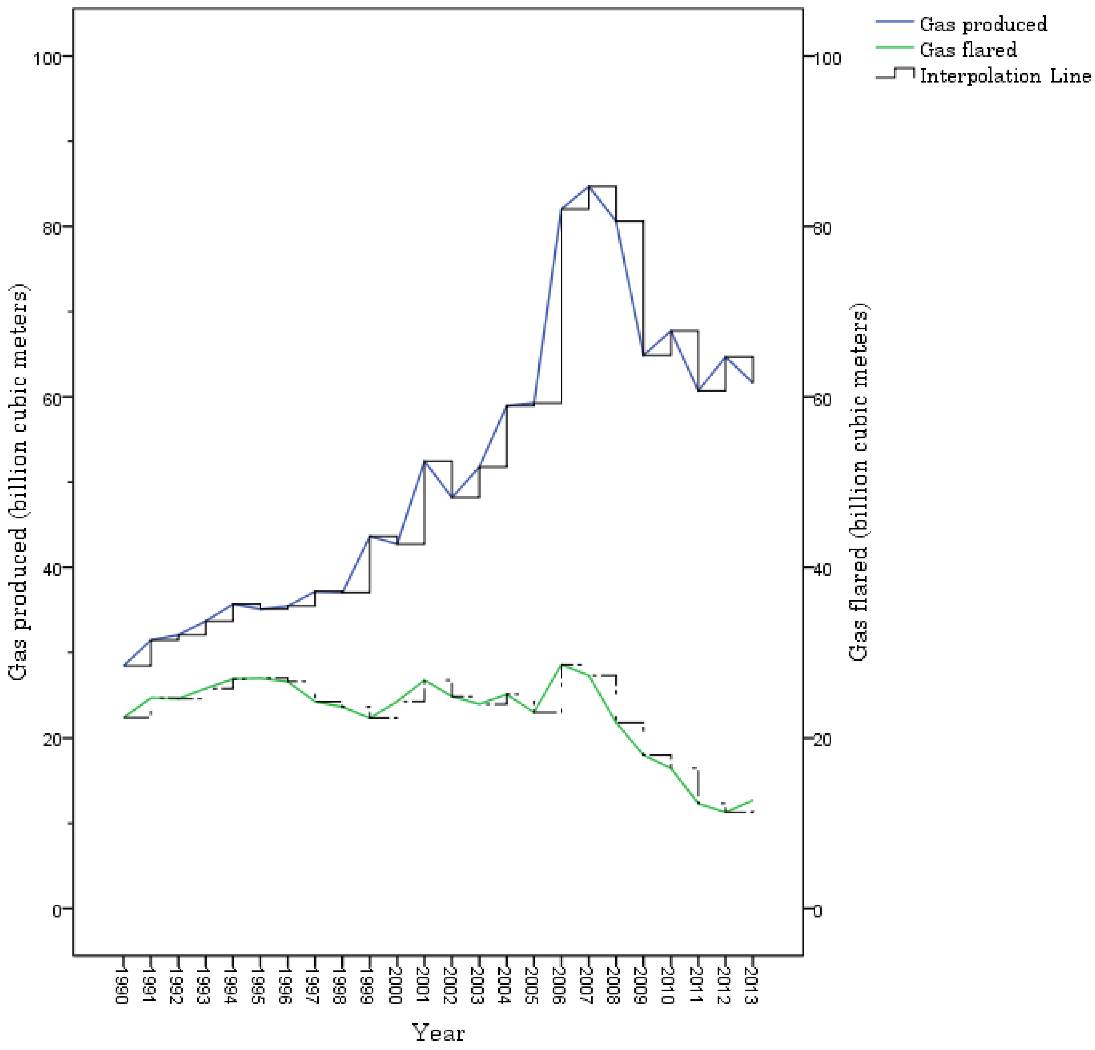 Quantity of gas produced and flared in Nigeria’s oil and gas industry (1990–2013). Source: Author’s computation, data from Niger Delta Environmental Survey [75], National Bureau of Statistics [76], Nigerian National Petroleum Corporation [77,78,79,80,81,82,83].