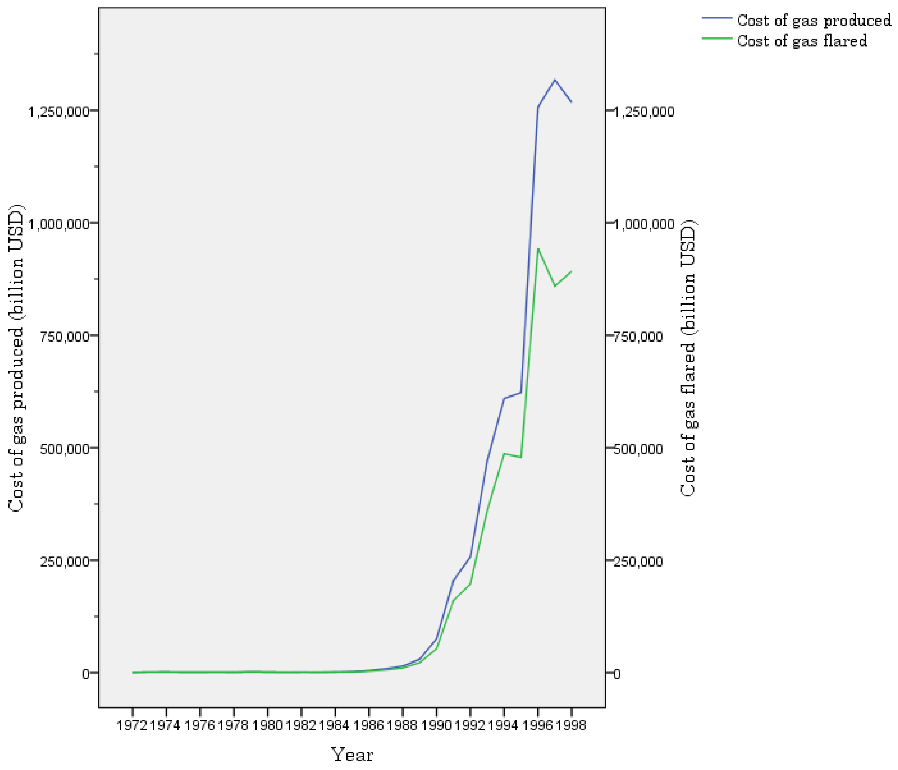 Cost of gas produced and flared 1972–1998 (Note: analysis is based on available data). Source: Author’s computation, data from Okoh [84]. Historical exchange rate values from [85].