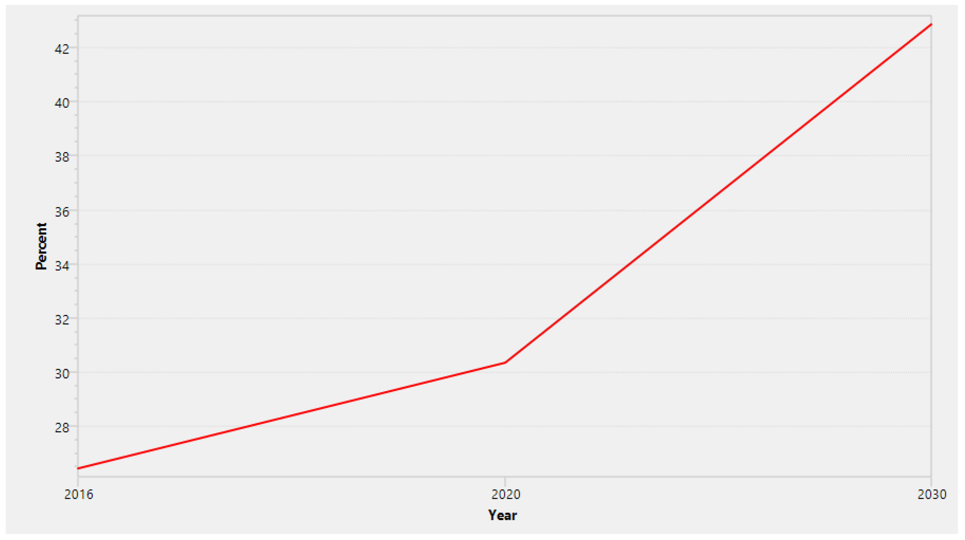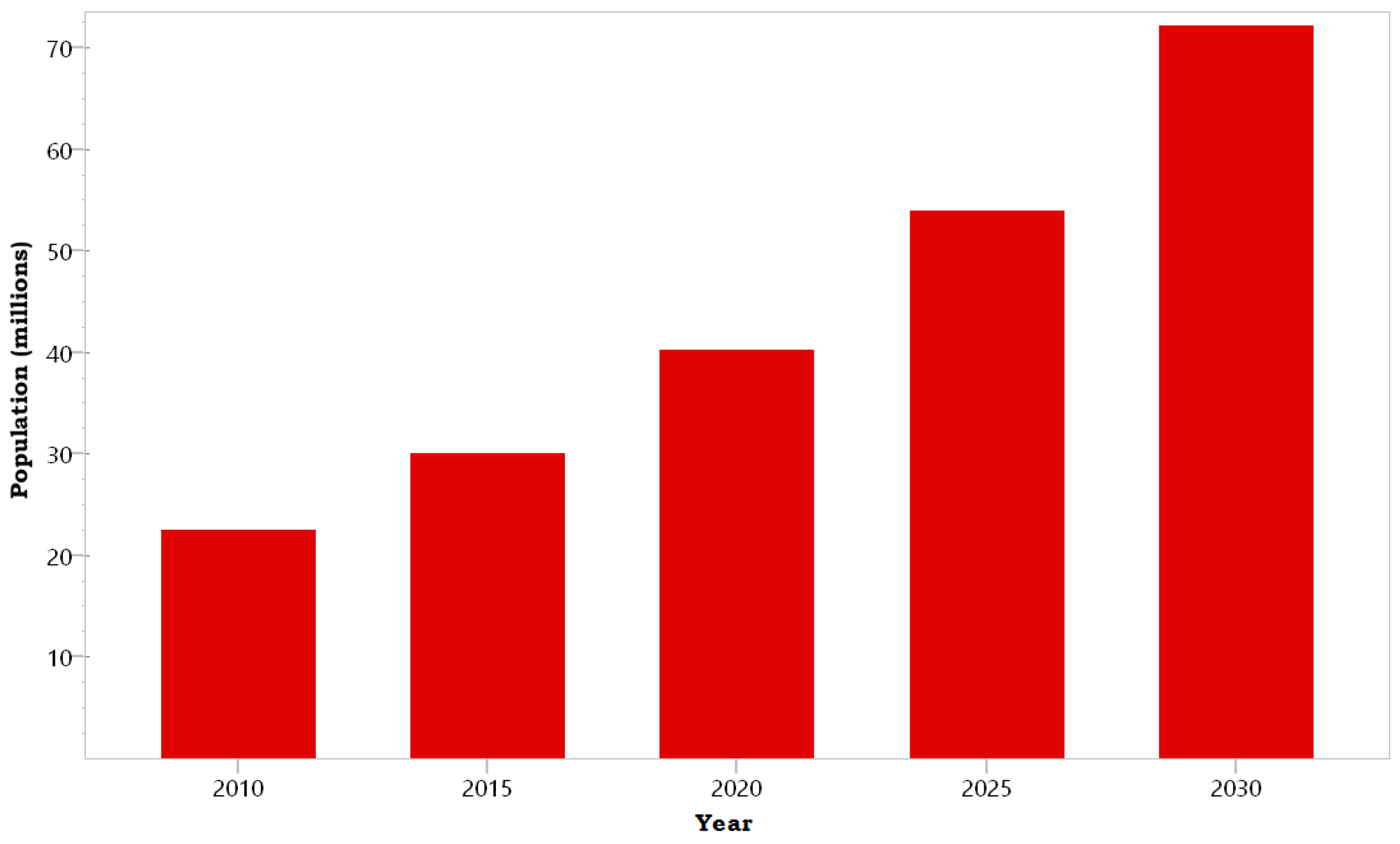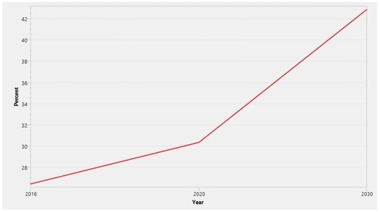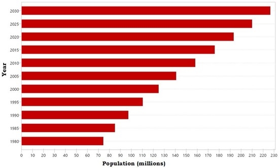 Results from the study reveals that in the year 2030, the population of Lagos state will be about 72 million people (Figure 5) while at a medium growth rate, Nigeria’s population in the year 2030 will be above 220 million people (Figure 6). This agrees with other studies [61,86,87,88].