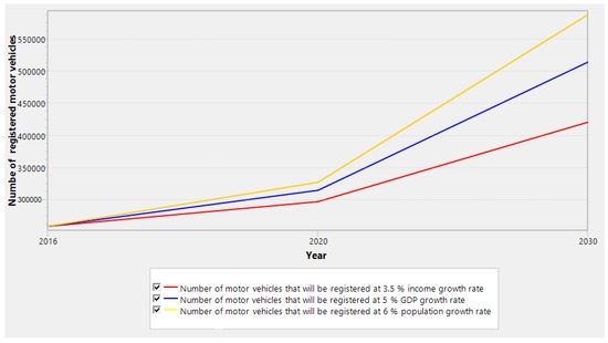 Total number of vehicles that will be registered in Lagos state in the year 2030 at population growth of 6%, GDP growth rate of 5%, and income growth rate of 3.5%. Source: Author’s computation, data from Lagos Bureau of Statistics [95,96].