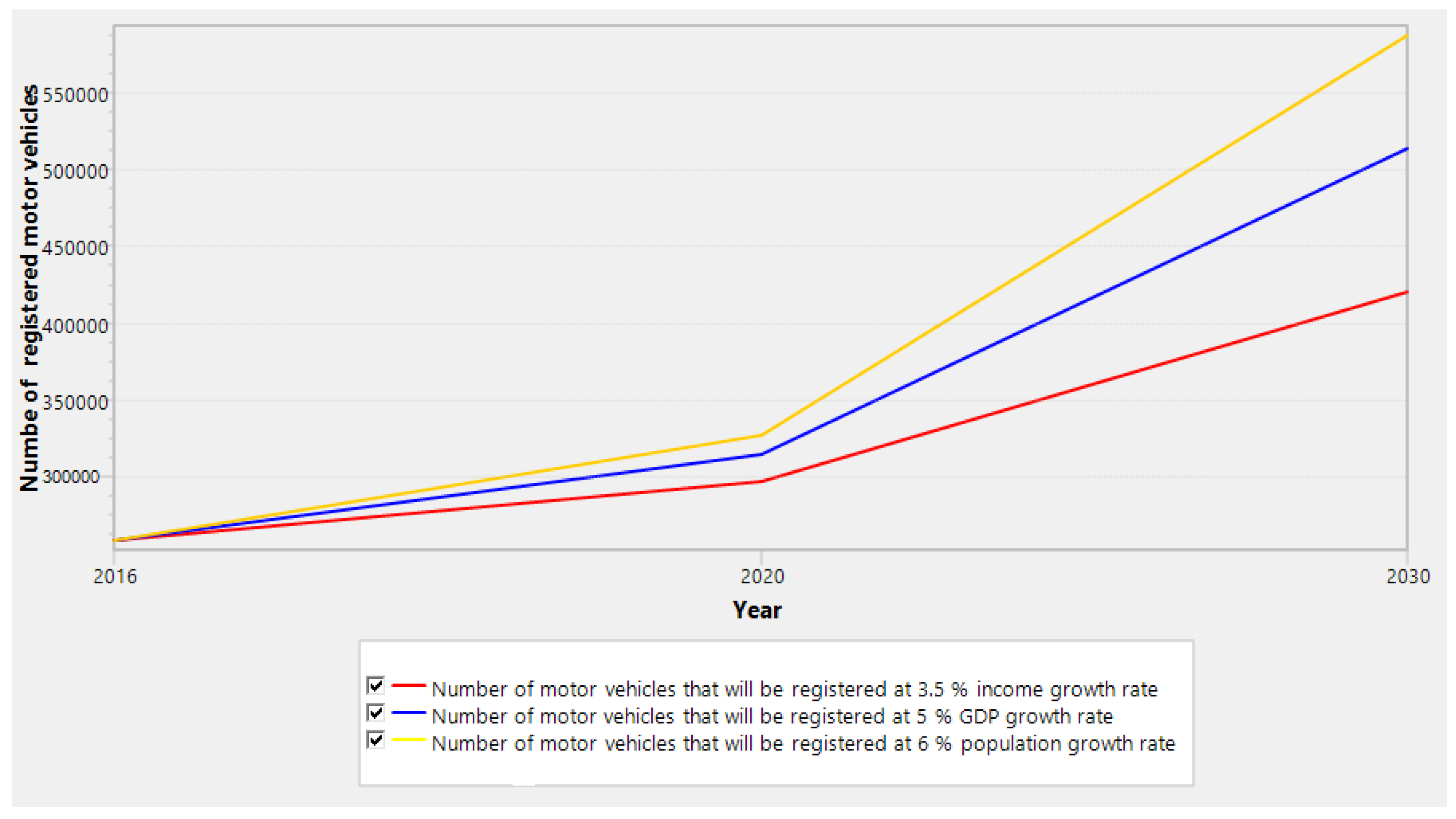 In most modernising societies, the demand for mobility especially motorised transport can be associated with economic development and population growth. Studies [89,90,91] reported that population and economic growth are major factors that influence transport demand. Increased transport demand significantly contributes to GHG emissions [92,93,94]. The statistics of total number of registered motor vehicles (Saloon/Station wagon, Van, Pick-up, Lorry/Truck, Minibus, Omnibus, Tanker, Tractor, Trailer and Tipper) in 2011 by Lagos Bureau of Statistics [95] was 259,473. The results from this study shows that the population, GDP, and income of Lagos State in 2030 will be 72 million people, 236 billion USD, and 8,591 USD at growth rate of 6%, 5% and 3.5% respectively. The total number of motor vehicles that will be registered in Lagos state in the year 2030 at this population, GDP, and income with varying growth rate will about 580,000, 510,000 and 420,000 respectively (Figure 7).