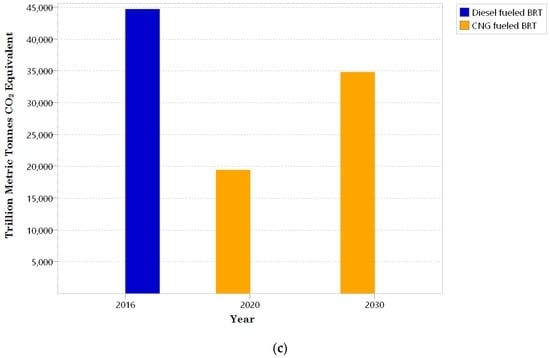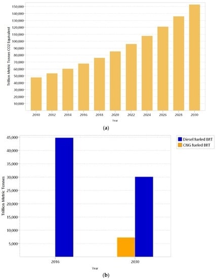 CNG is an efficient transportation fuel especially for urban transit. CNG vehicles are economic, modern and reliable option to diesel vehicles and they have greater level of reduction of GHG emissions and noise pollutions when used for urban transport [48,49,50,51,52]. Studies [53,54,55,56] reveal that the Fuel economy of CNG buses ranges from 2.51 to 7.37 miles per diesel gallon equivalence (MPDGE) depending on the bus capacity and travel distance. Potentials for reduction of GHG emissions with vehicles using CNG has been reported in Greater Cairo, Egypt [57] and Jakarta, Indonesia [58]. In Greater Cairo [57] results showed that the maximum emission factor of 2.6 kg CO2/kg fuel for CNG vehicles which was lower compared to the maximum of 3.1 kg CO2/kg fuel for gasoline and diesel. By switching the diesel busway buses with modern CNG buses, the findings from Jakarta [58] recorded reduction in NOx emissions (8%) and PM emissions (77.5%). Examples of countries that run CNG buses for BRT in their cities include, Argentina, Australia, Brazil, China, Indonesia, Italy, Peru, France, Pakistan, Republic of Korea, Thailand, and United Sates of America [32,34,40]. Australian BRT services are identified globally as eco-friendliest because all the BRT buses in its cities run on CNG [51].
