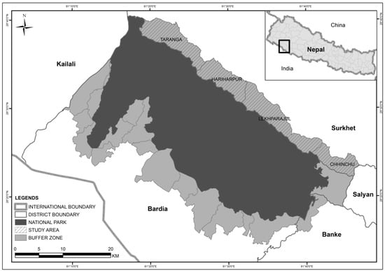 The National Park is 968 sq km in area and a buffer zone surrounding the park adds another 507 sq km (see Figure 1). There are no human settlements or agricultural land inside the boundaries of the national park (settlements were relocated during the establishment phase of the park, see [26]). However, a mixed heterogeneous society, including indigenous Tharu people and migrants from the hill areas (Pahade) live within the buffer zone areas. Settlements, agricultural land and community forests are all embedded within the buffer zone areas. Around 120,000 people utilize the park and its buffer zone forests for various resources to support their livelihoods [28]. The buffer zone area comprises fragile Siwalik where landslides commonly occur. During 2014, the landslides in the Siwalik caused flooding in the Bheri River, which claimed the lives of nearly 50 people and destroyed 321 houses in four village development committees within the study area (unpublished data of District Administration Office, Surkhet). The settlements adjacent to the northern part of the park (the study area) were established relatively recently. Migrants from the adjacent hills moved into this location about two hundred years ago. At the time of arrival, migrant people chose to settle in locations where land was either freely available, or available at a very low cost, and where forest resources were available to support livelihoods, which were resourced via subsistence agriculture and animal husbandry. Often, people migrate to lower, more fertile land after they have earned some money to purchase land in more productive locations. Therefore, the study area is somewhat of a transit settlement for economic migrants from the hill areas. This study was conducted in the northern part of the buffer zone surrounding Bardia National Park.