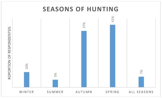 In response to questions about the seasonality of hunting, 41% participants indicated that spring was the season in which most hunting traditionally occurred. Autumn was named by 37% of the participants, winter by 10% of participants, and summer by 5% of participants. Seven percent of participants indicated that hunting occurred in all seasons (n = 41 for this question, Figure 2).