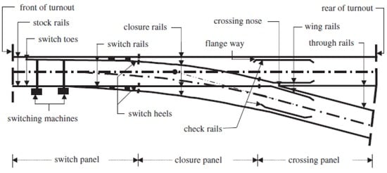 Turnouts are generally comprised of a switch panel and a crossing panel, connected by a closure panel in between. As part of each of these panels, minor components are assembled for the entire turnout system, and each of them can be seen in Figure 1. Because of its complexity, the interactions between the wheel and the rail in these elements are the principal issue in the design and maintenance of railway systems, and thus these are among the most sensitive parts of the railway systems. Over time, the wheel/rail contact changes along the turnout, transferring the interaction from the stock rail to the switch rail, and, finally, to the crossing nose through the closure rails. Due to the high level of interaction and quantity of components, these special trackworks are involved in noise propagation in railways []. Particularly, the type of noise involved in these elements are often the impact noises generated from the crossing transfer zone and also the screeching noise, which will be further explained in the next section of this paper.