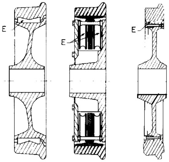 Various resilient wheels. E stands for the location of the elastomeric damping material [].