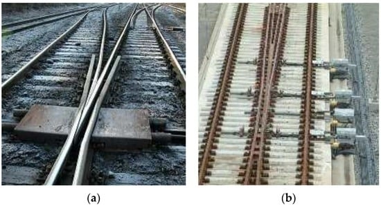 This study pays special attention to the special trackwork systems that are essential components in railway infrastructure, since they provide flexibility to traffic operation. It is important to note that switches and crossings, which, according to maintenance databases, stand for one of the major causes of track failures and defects (which can potentially lead to train derailments), requiring high maintenance costs []. Hence, this topic will describe its components and its effects on railway noise generation sources, as well as its impacts on life cycle costs.